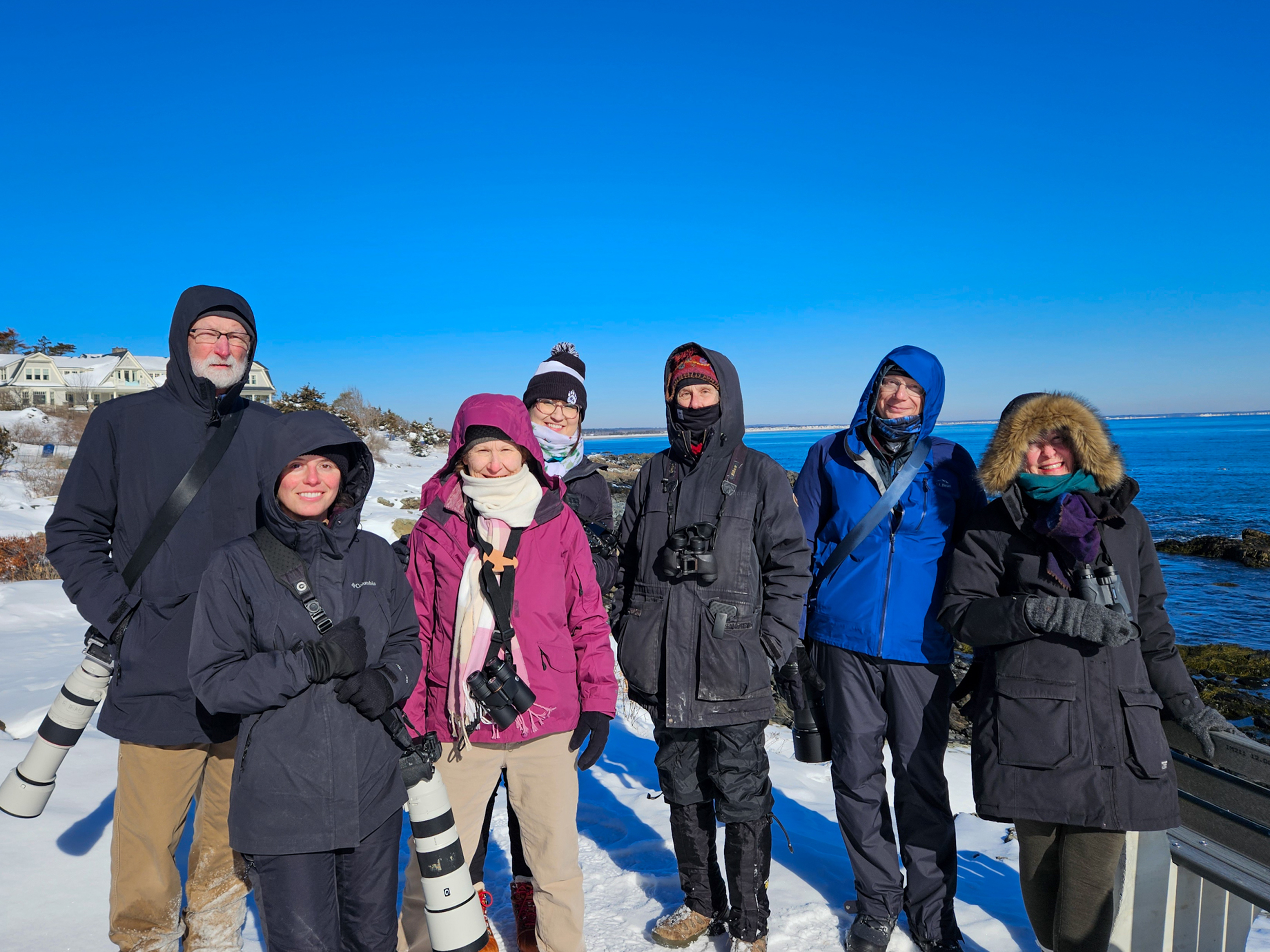 Between astronomical low tides, days of offshore winds, and recent bitter cold, we encountered many fewer waterbirds overall than expected at this season. We did see some of the stars of the winter show well, such as Harlequin Ducks – always the crowd favorite! – and Great Cormorants. At two sites, we worked our way through learning the various seaducks, while at two other sites we studied dabbling ducks. A short gull workshop was also included. We even finished with another family of waterfowl when a hen Greater Scaup landed in Perkin’s Cove when we returned at the end of the day.