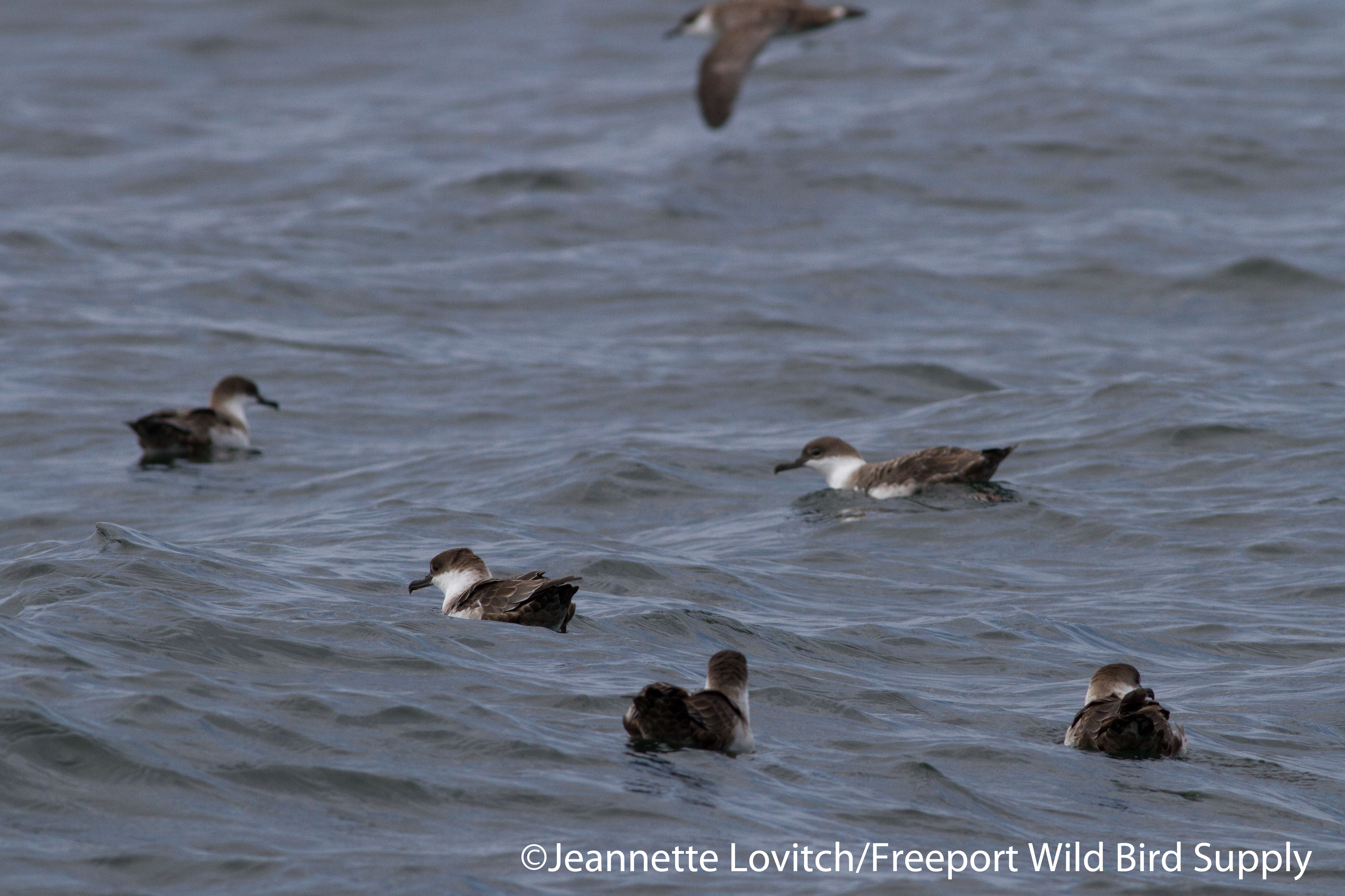 About a mile away from Mount Desert Rock, we hit pay dirt: massive rafts of Great Shearwaters. We sailed through them, and then back through them. The lack of wind was keeping them on the water, and most just paddled away from our slow-moving ship. I began to chum. You could say it worked. It worked really, really well.