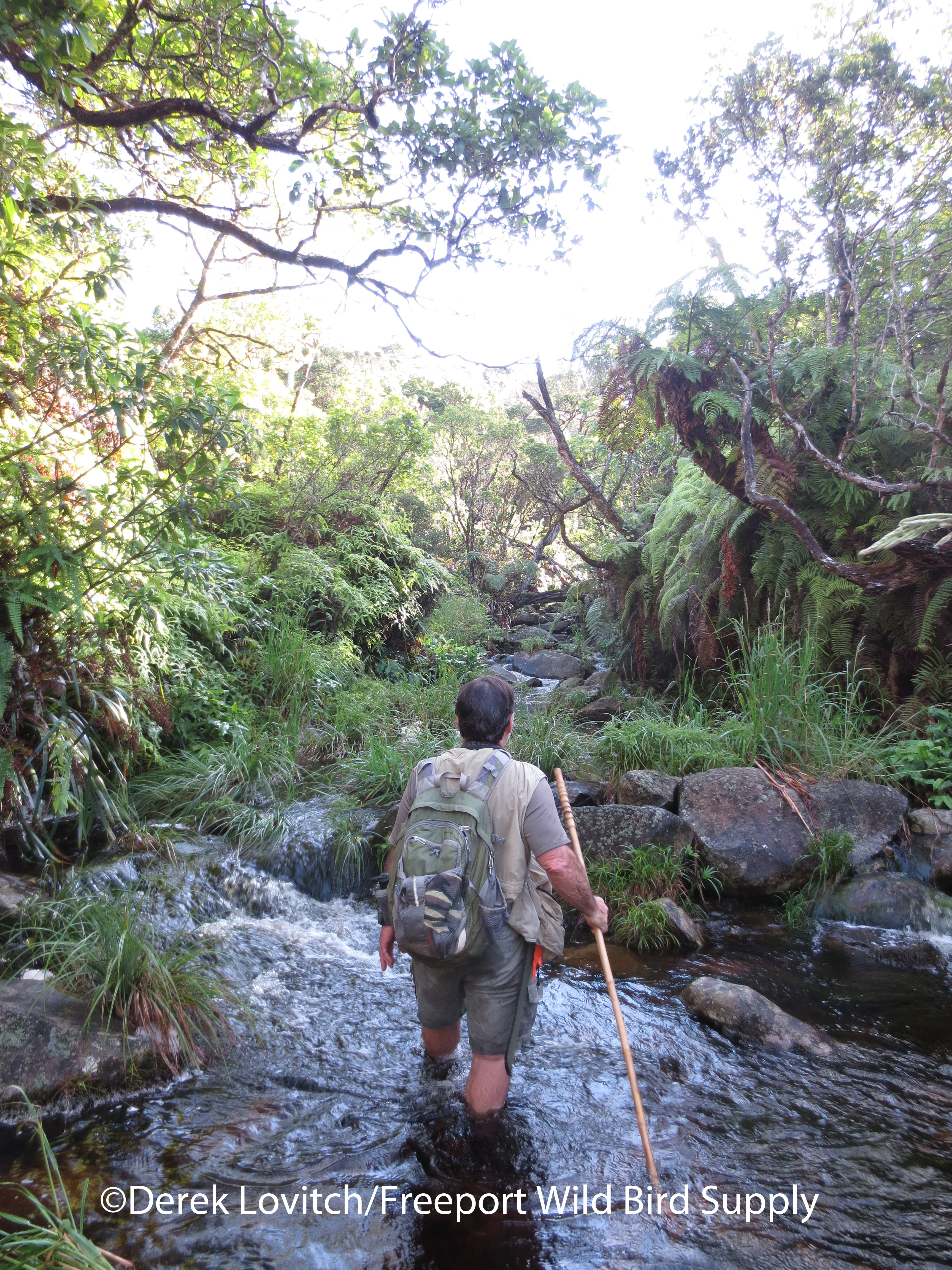 Our second full day on Kaua’i was a big one, and what would turn out to be an exhausting and somewhat painful one. We met David Kuhn (www.soundshawaiian.com – be sure to check out some of his recordings!) near sunrise for a trek into the famous Alaka’i Swamp in pursuit of Kauai’s endemics. Perhaps his question the day before of “do you have shoes for the water?” should have suggested we might be dealing with a little more than puddles and mud. But, since this is the wettest place in the islands – and by some estimates at least, one of the wettest places on Earth – we figured we would have to deal with some standing water. But in fact, we were pretty much always standing in the water, as David took us off-trail and up rocky mountain streams in pursuit of Puaiohi and the endemic honeycreepers.