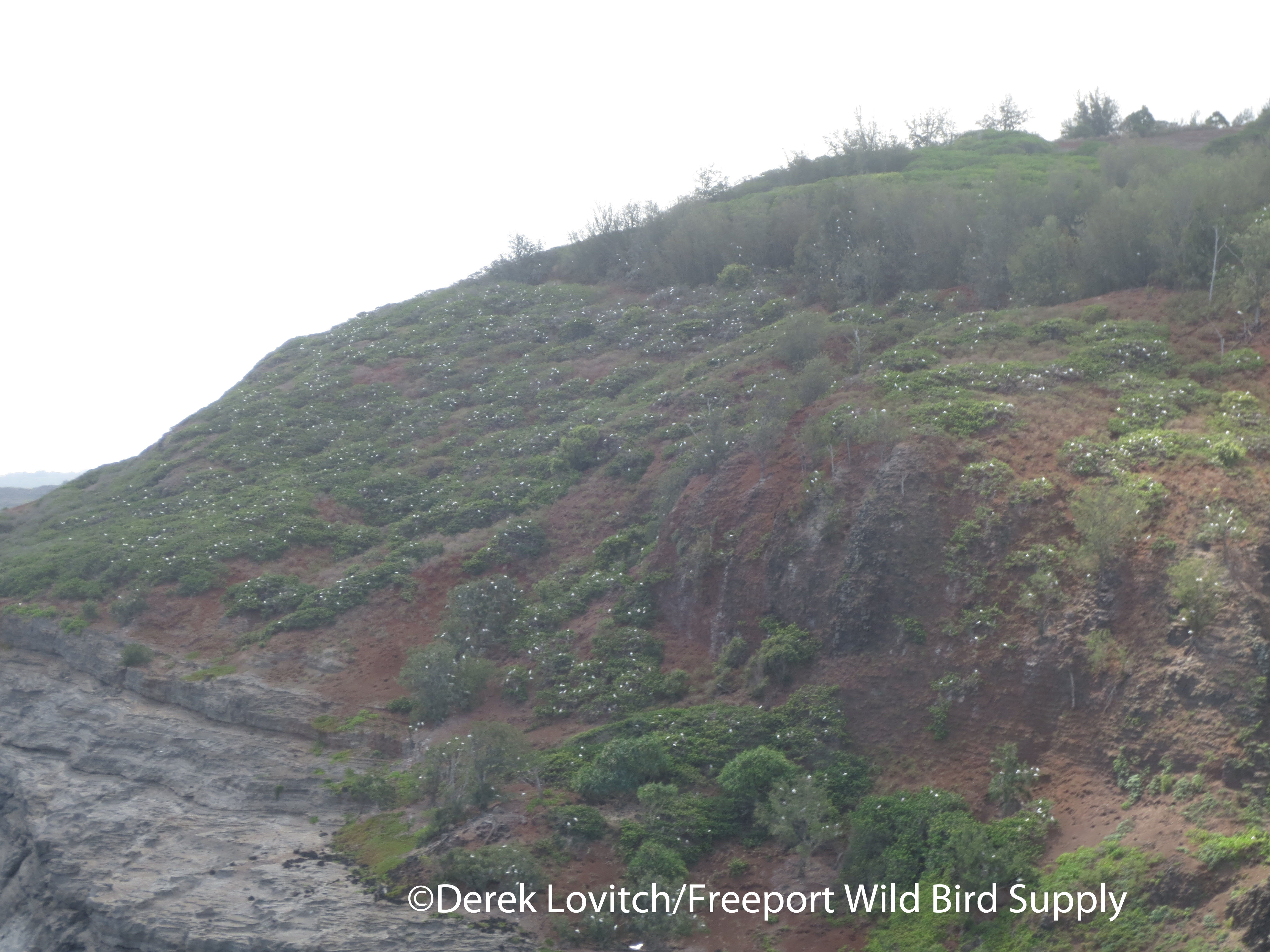 Nenes on the lawn, Great Frigatebirds overhead, many hundreds of Red-footed Boobies nesting on the cliffs…Red-tailed and White-tailed Tropicbirds, including many red-tails engaging in their unique backwards-wheeling display flights. But at this time of year, the real highlight here are the nesting Wedge-tailed Shearwaters. Some are nesting a mere inches from the walkways. Occasionally we would see an adult darting to or from the sea, but most of the birds were tucked away in their burrows – some of which were decidedly more sheltered and secure than others (and some were merely a scrape under a bush!). Seeing adorable, fuzzy tubenose chicks at arm’s length is not a regular occurrence for us.