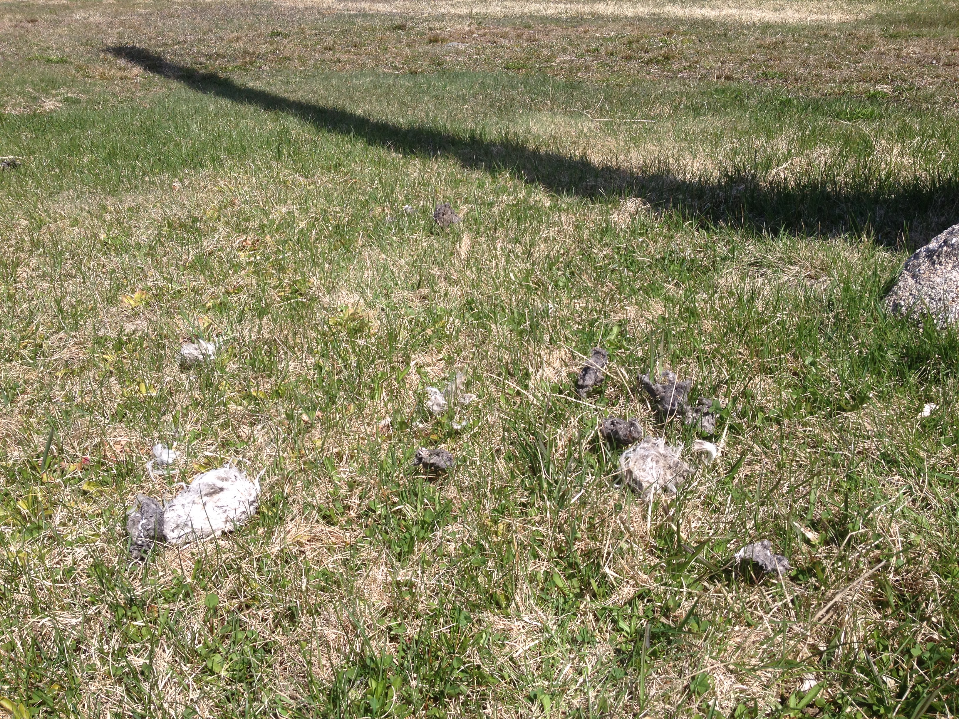 A little further down the road, where the second of the Mile Stretch Snowies overwintered, we found a pile of pellets below one of that bird’s favorite perches. Most were full of small mammal fur and bones, and the skulls were all of voles. One pellet, however, was pure thick, downy feathers – probably from a duck.