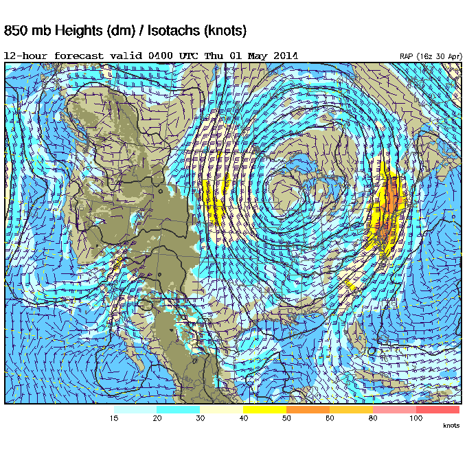 Here we see the massive low pressure system marching across the Great Plains. But now, on the leading edge of it, we see a deep southerly flow, originating all of the way from the Gulf Coast. This southerly flow is expected to last for at least the next 48 hours.