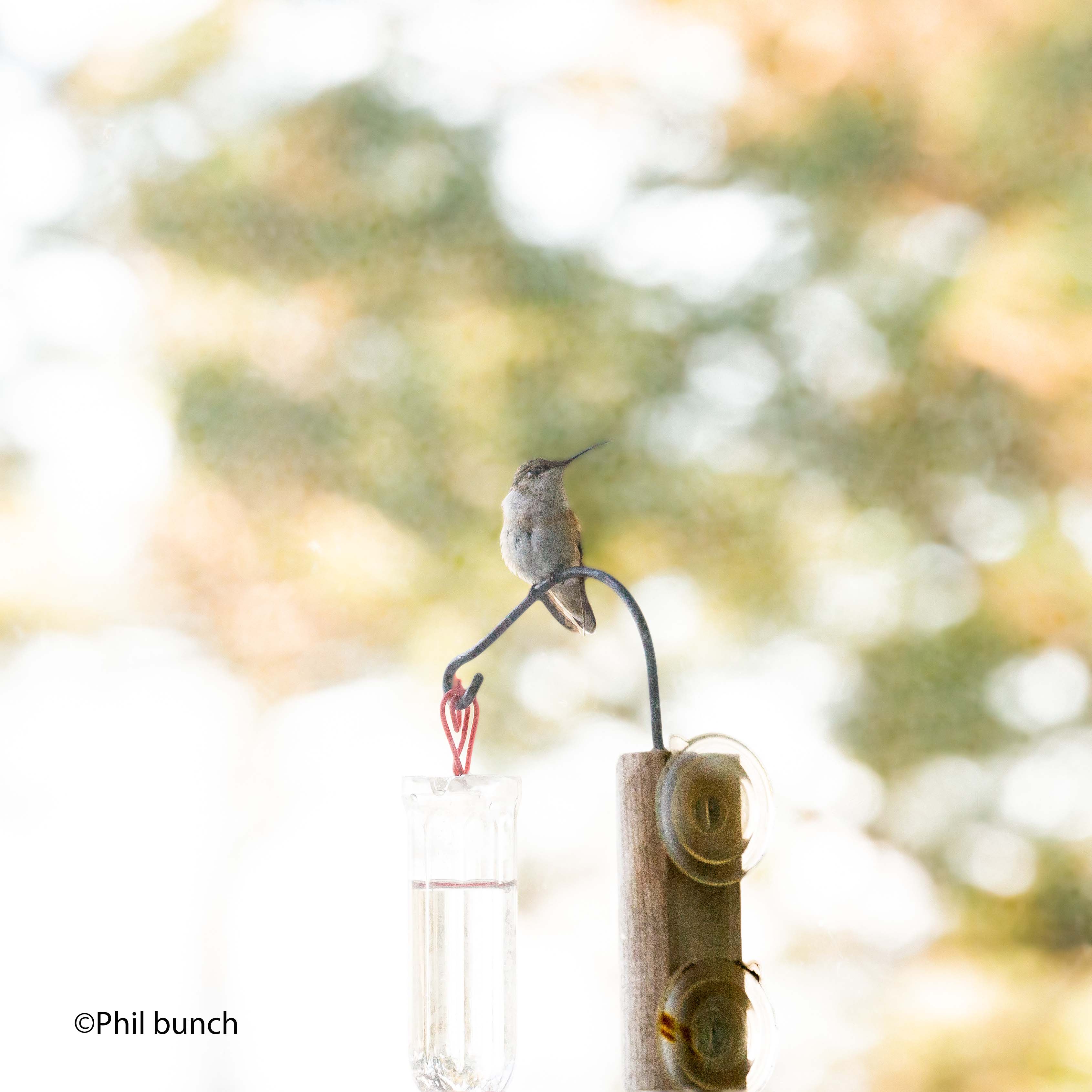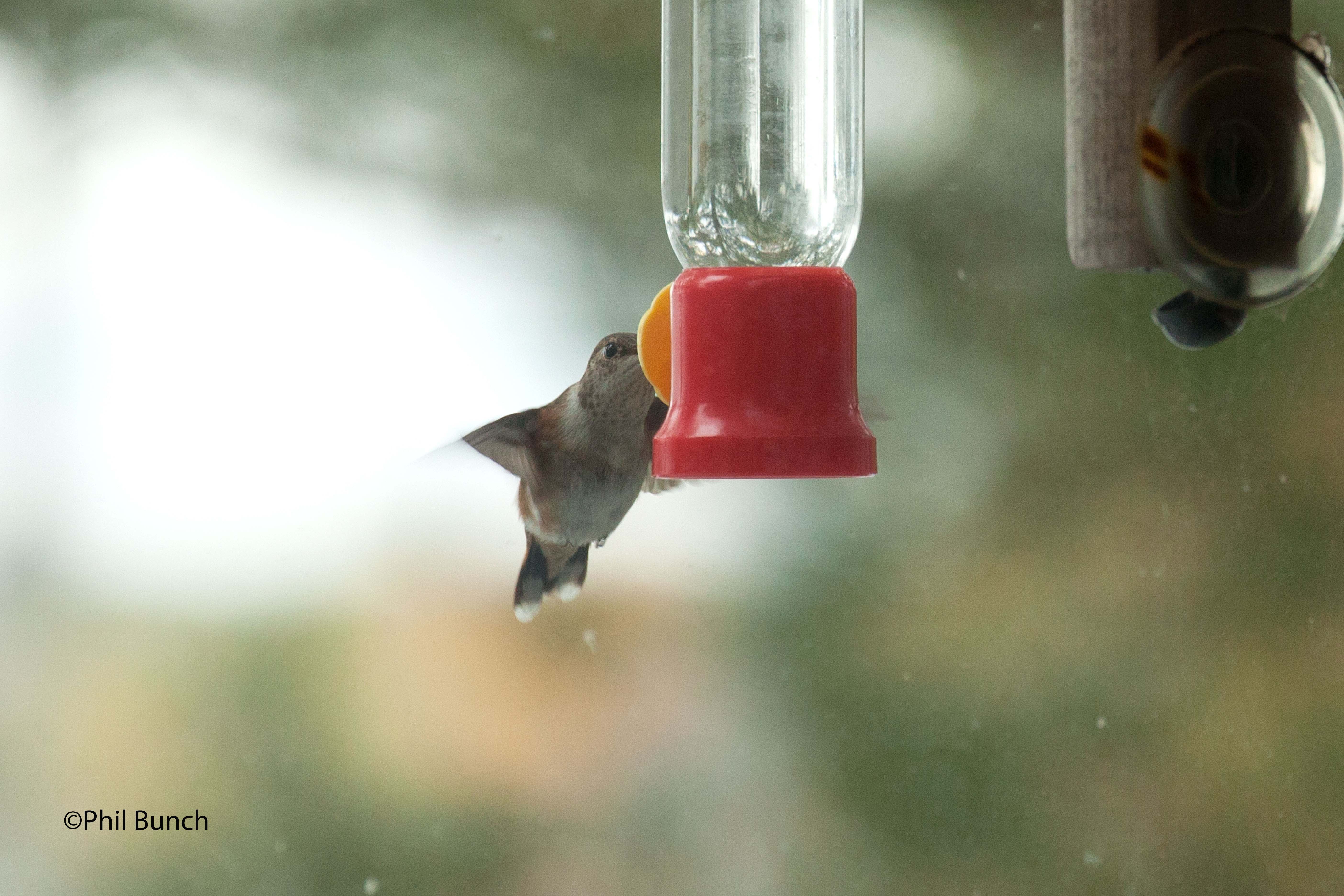 I received all of the photos today (10/22) and was able to take a long, hard look at them with references handy. It’s clearly a hummingbird of the genus Selasphorus, with its extensive buffy sides, buffy undertail, and – although it’s really hard to see – just a hint of the rufous in the base of the tail feather (see Photo 1). There’s not much here to work with, but the overall pale plumage and limited rufous-orange further suggests that this bird is an immature female, although some young males can be equally as pale.
