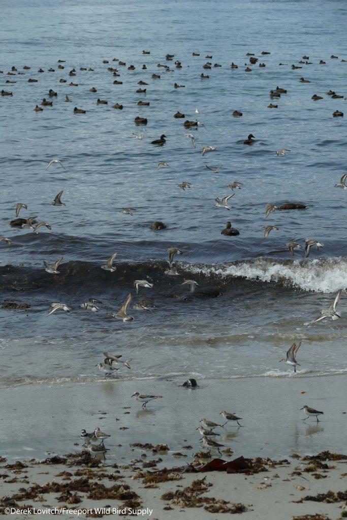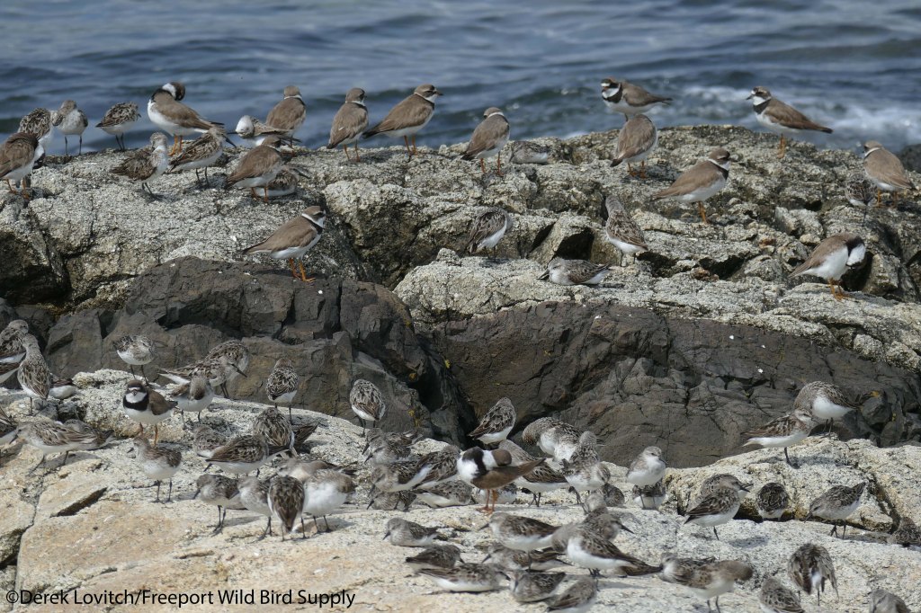 Semipalmated Plovers and Semipalmated Sandpipers waiting out the high tide off of Biddeford Pool Beach on 8/20.