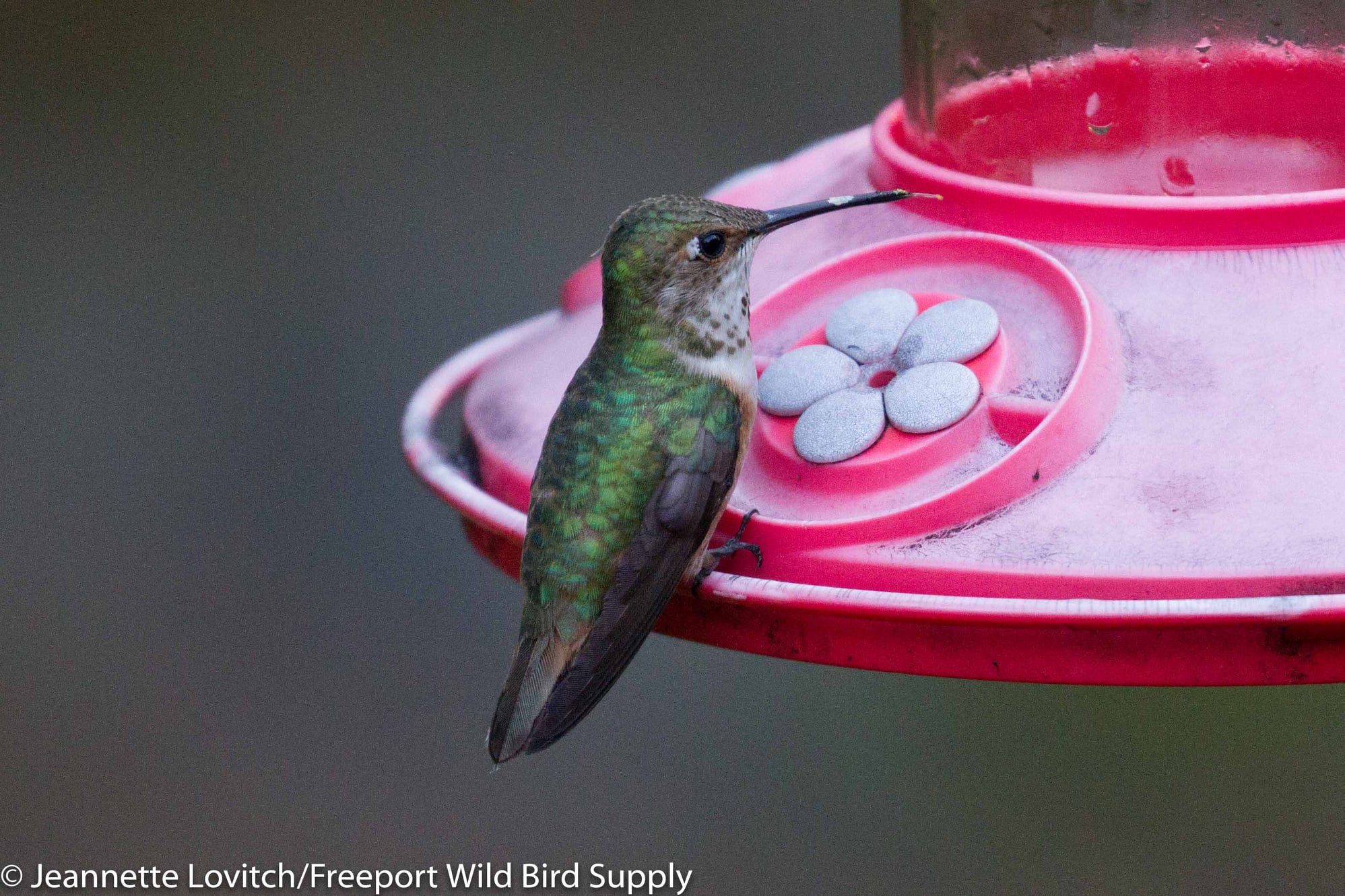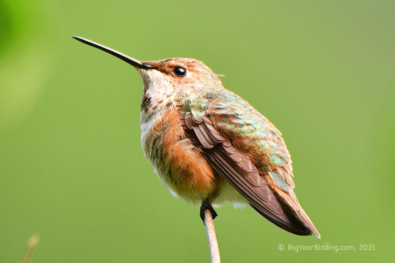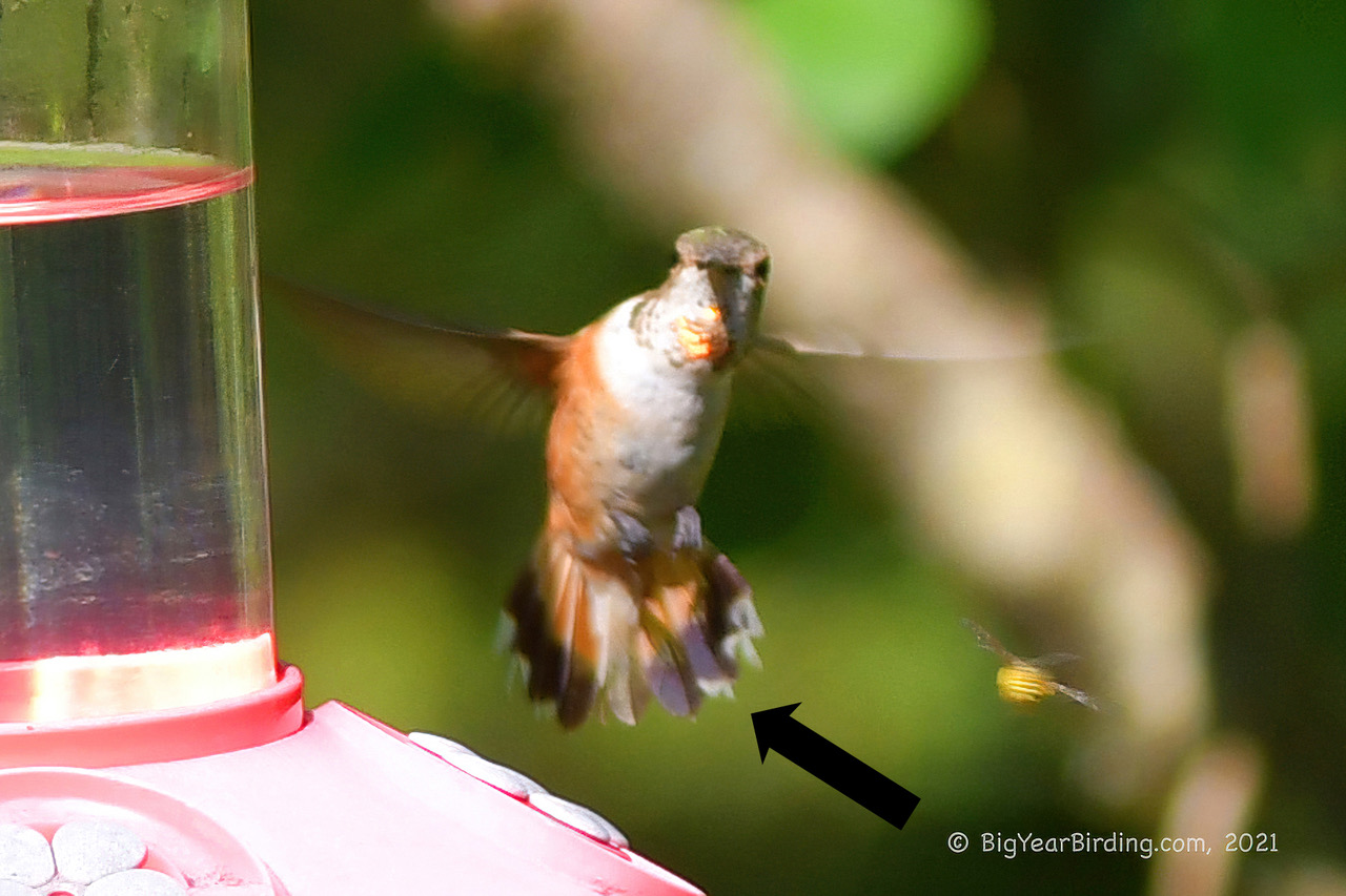 His arrows point to the critical R2, the 2nd tail feather from the center on each half of the tail. On most – but not all – adult female Rufous Hummingbirds, there is an emargination (often called a “nipple tip”) which is not present on Allen’s Hummingbird. Unfortunately, this birds tail is worn – not surprising at this time of year – and the exact original pattern is just impossible to deduce.