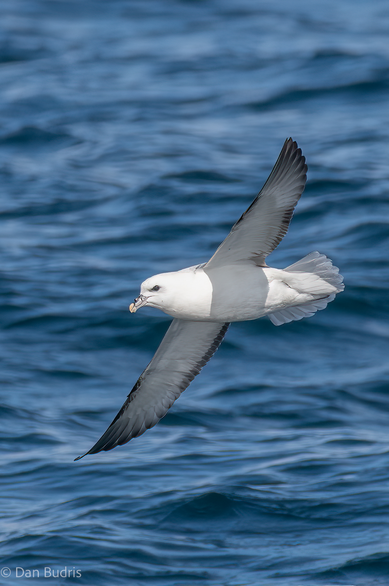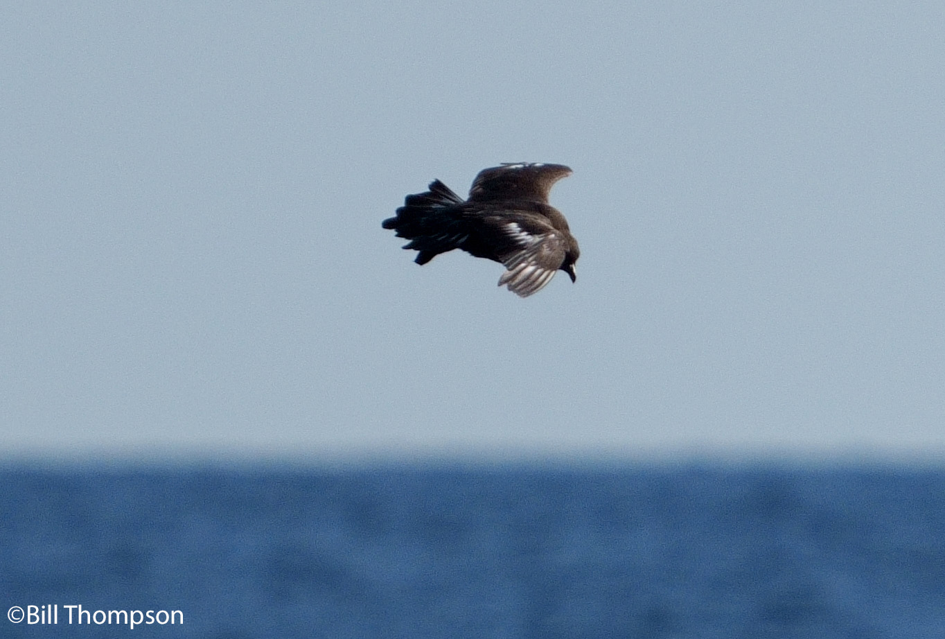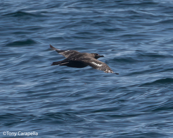 We spotted a large, dark, and very heavy-looking skua/jaeger in flight parallel to the boat. Captain Nick did an exceptional job of staying with it, staying parallel to it, affording incredible views for an unusually long amount of time. We were traveling at 18.2 knots, and the bird was slowly taking the lead. When it looked like it was thinking of landing, I had Nick angle slightly away so as not to make the bird concerned. It worked! It landed, we slowly worked our way up to it, and almost circled it before it took off. High-fives were exchanged. Smiles reigned. We got a skua! Big, barrel-chested, thick dark bill, and short tail. The very cold tones and extensive molt strongly suggested South Polar Skua. It would be a life bird for many.