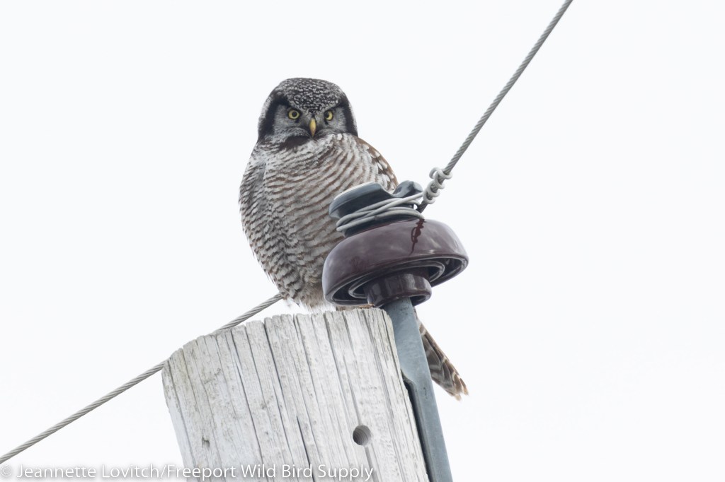1 continuing NORTHERN HAWK-OWL and 1 Northern Shrike, Piscataquis County, 2/12 (with Jeannette). Photo above.
