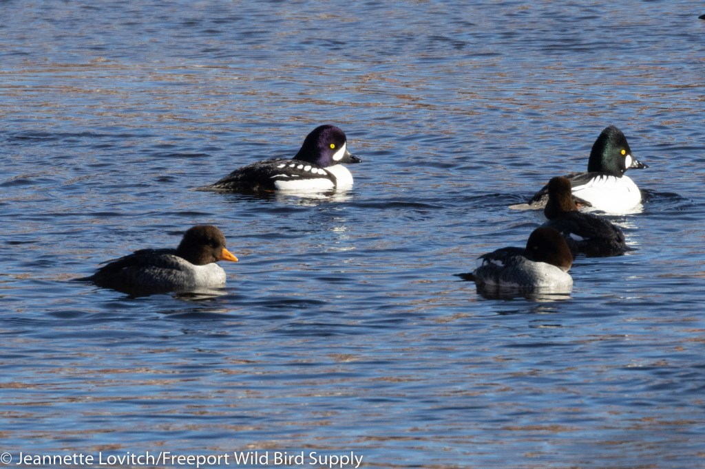 1 continuing hen COMMON EIDER SPP BOREALIS and 6 BARROW’S GOLDENEYES (4 drakes, 2 hens), Winslow Park, Freeport, 2/21. Barrow’s usually peak here at the end of February.