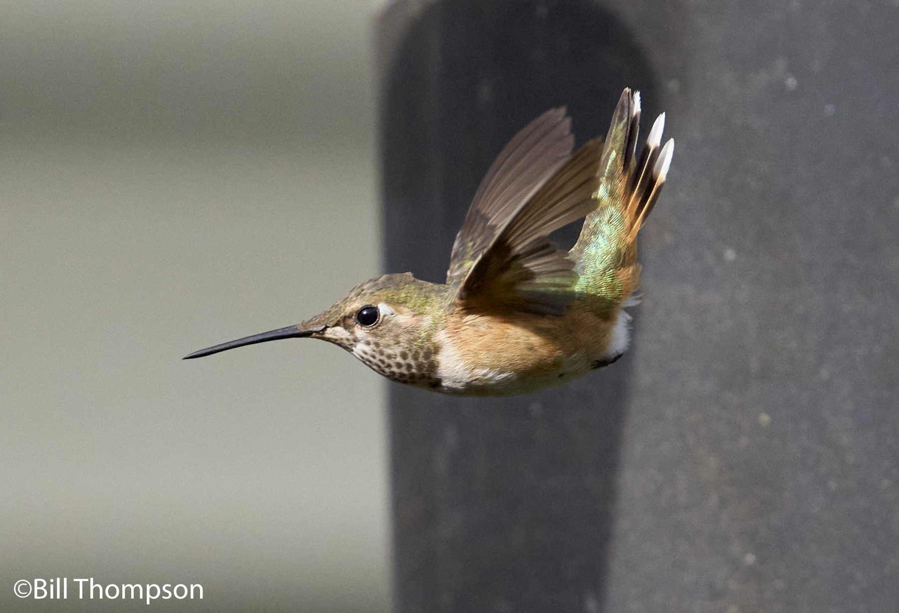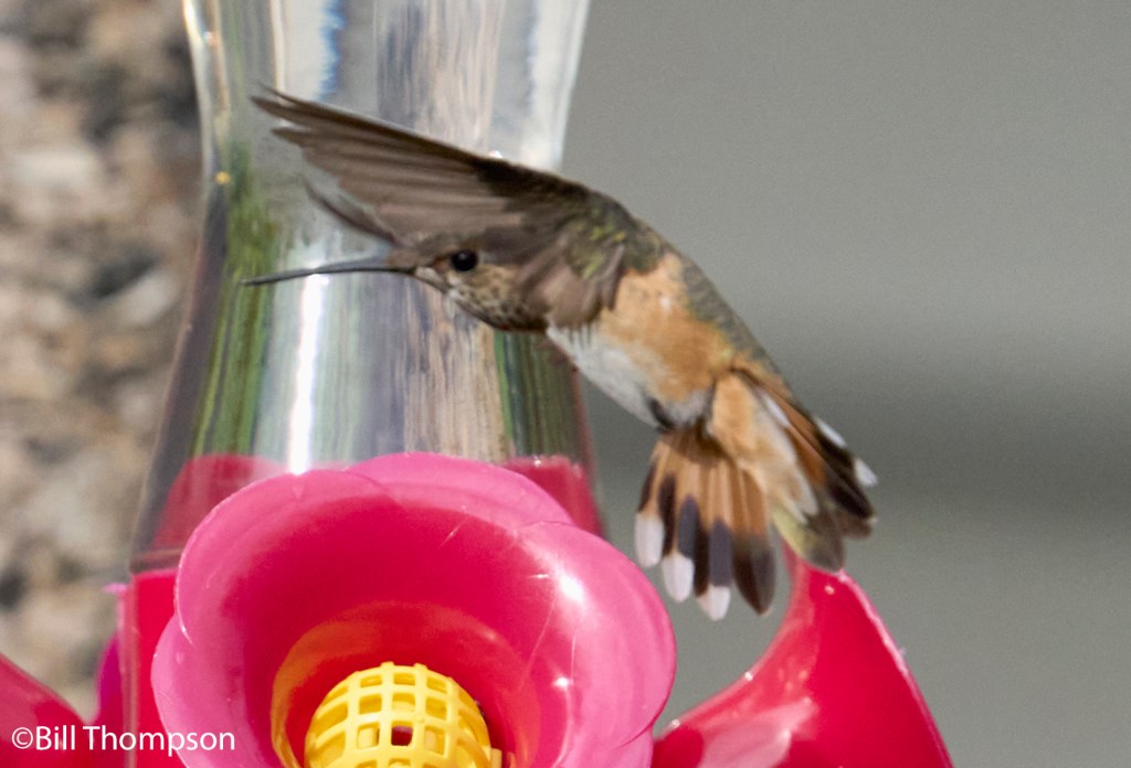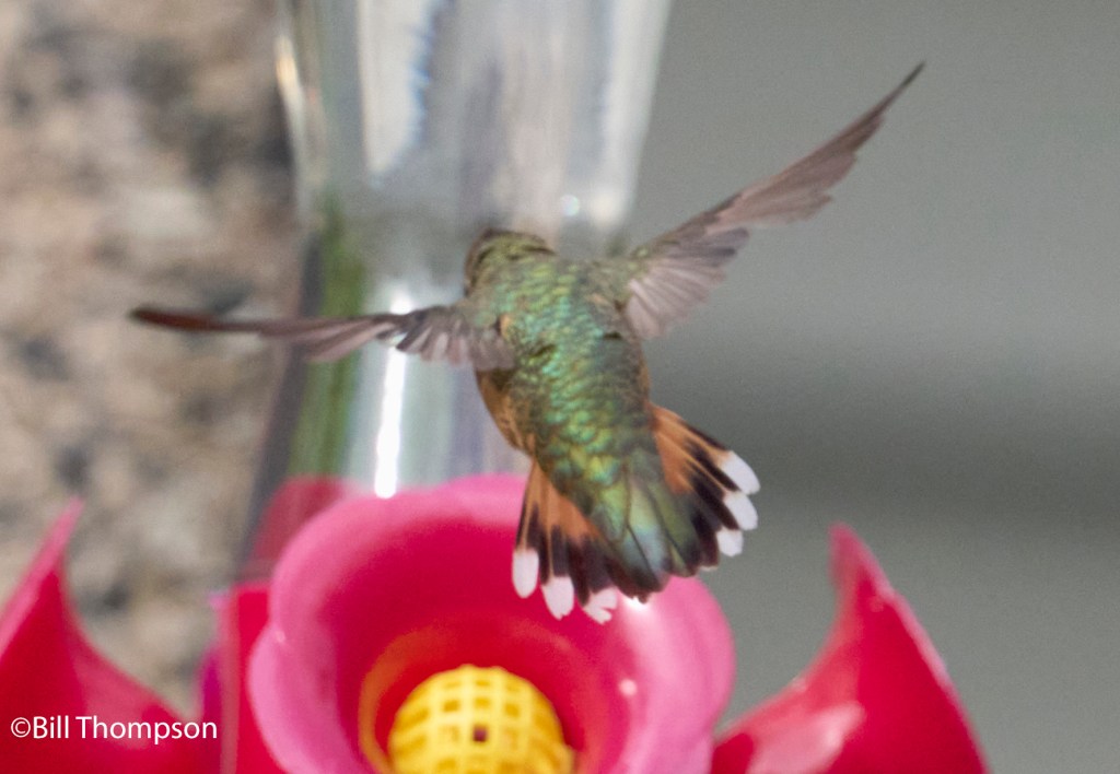 Sue took some photos through her window and screen, and they suggested a warmth in overall color to the bird that would be on the extreme end of Ruby-throated Hummingbird. Sue invited me over for a look, and after waiting for about 45 minutes in the early afternoon on November 2nd, the bird appeared and soon flashed the reddish-brown in the tail indicative of a hummingbird in the genus Selasphorous.