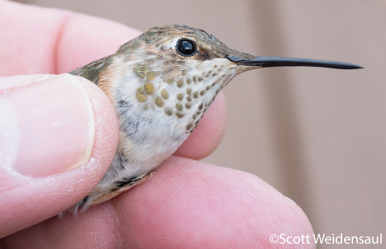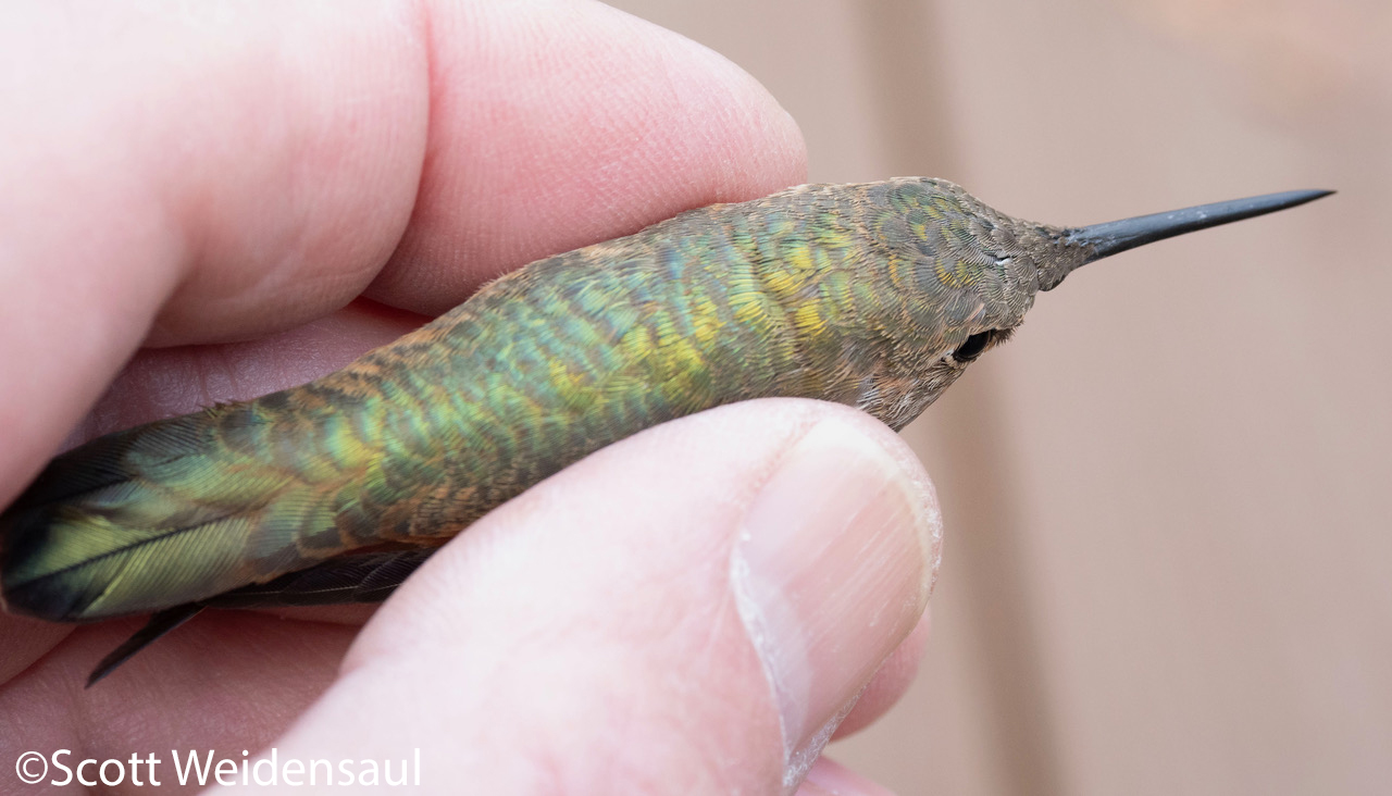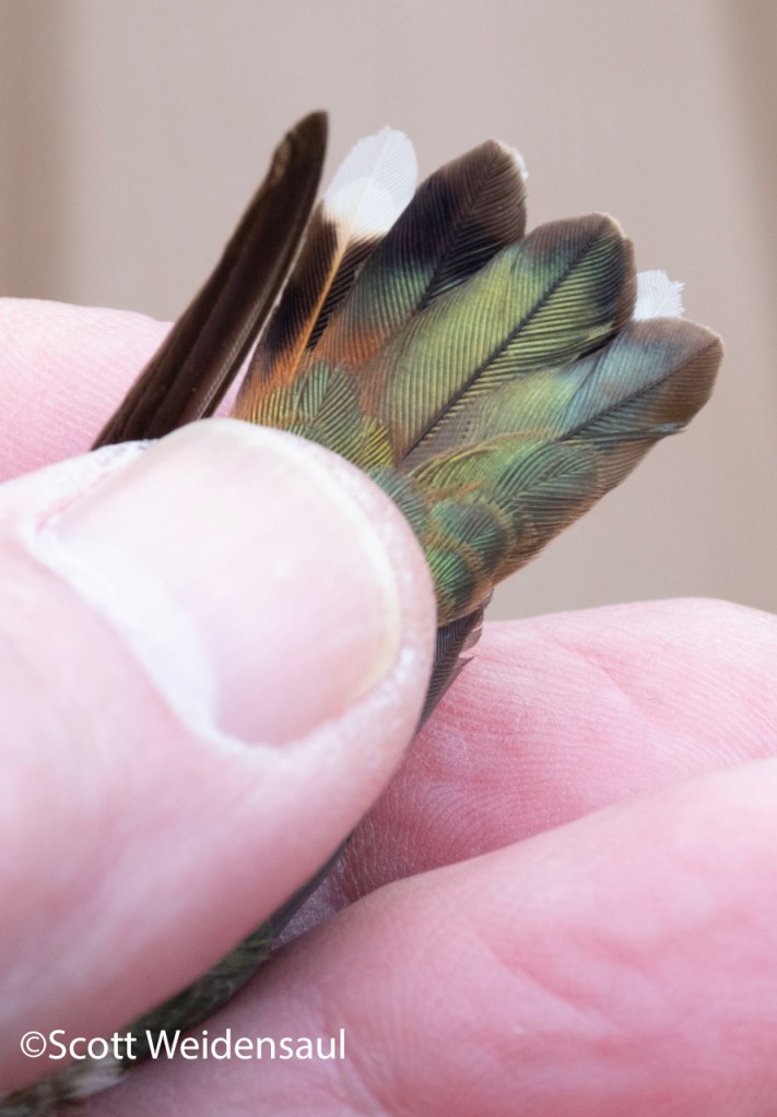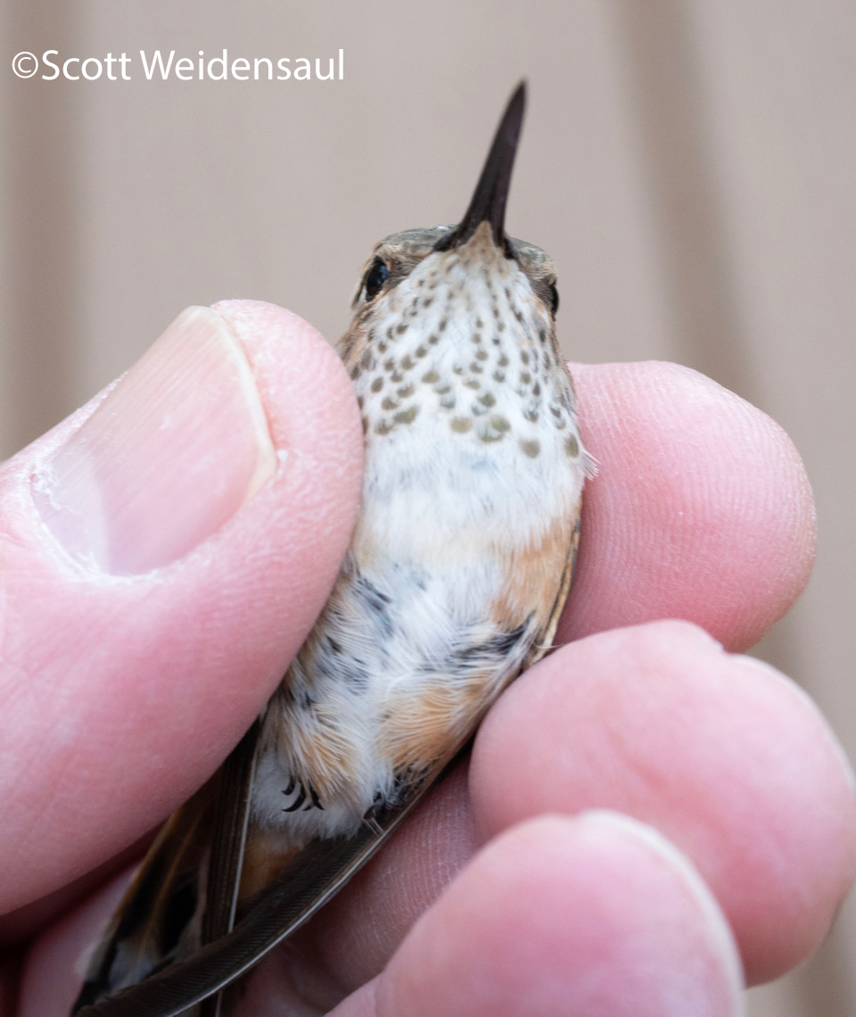 Scott then said, “All of her measurements are in line for a female rufous vs. and Allen’s. Her wing, tail and culmen measurements are all good for RUHU but beyond the upper limit for ALHU, which would lack the slight notch or nipple on R2. All in all she seemed to be in great shape and was quiet and cooperative in the hand.”