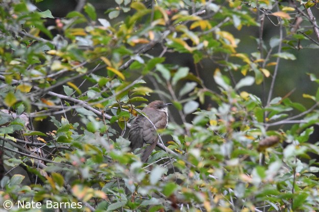 In fact, it was pretty darn slow, at least in the brush and the woods. Offshore, waterbirds were building, and we had some good looks at Surf Scoters, for example. And overhead, there was an absolute massive Double-crested Cormorant migration going on. Numerous large flocks of several hundred were winging it south, in their usual “drunken v’s.”