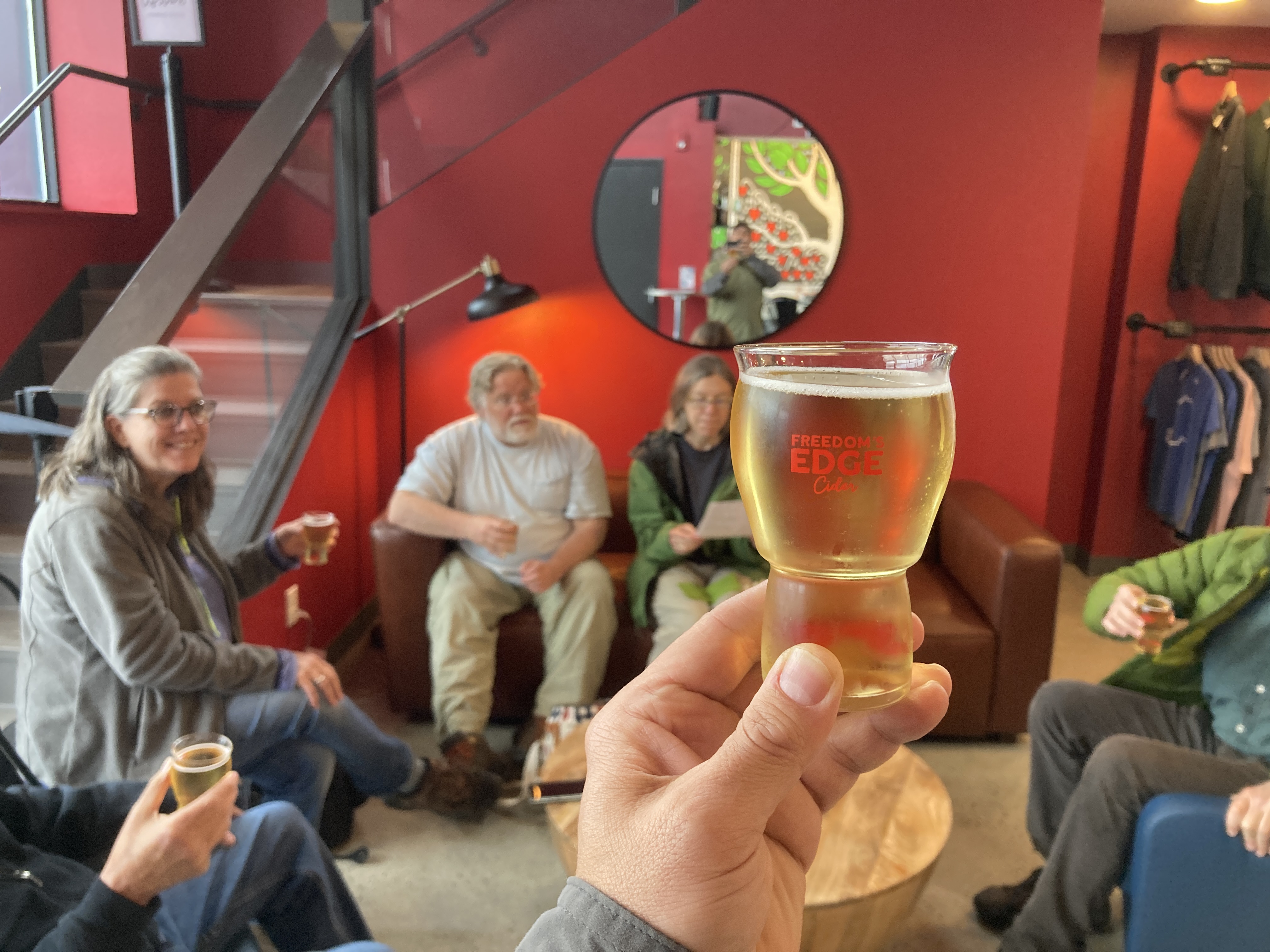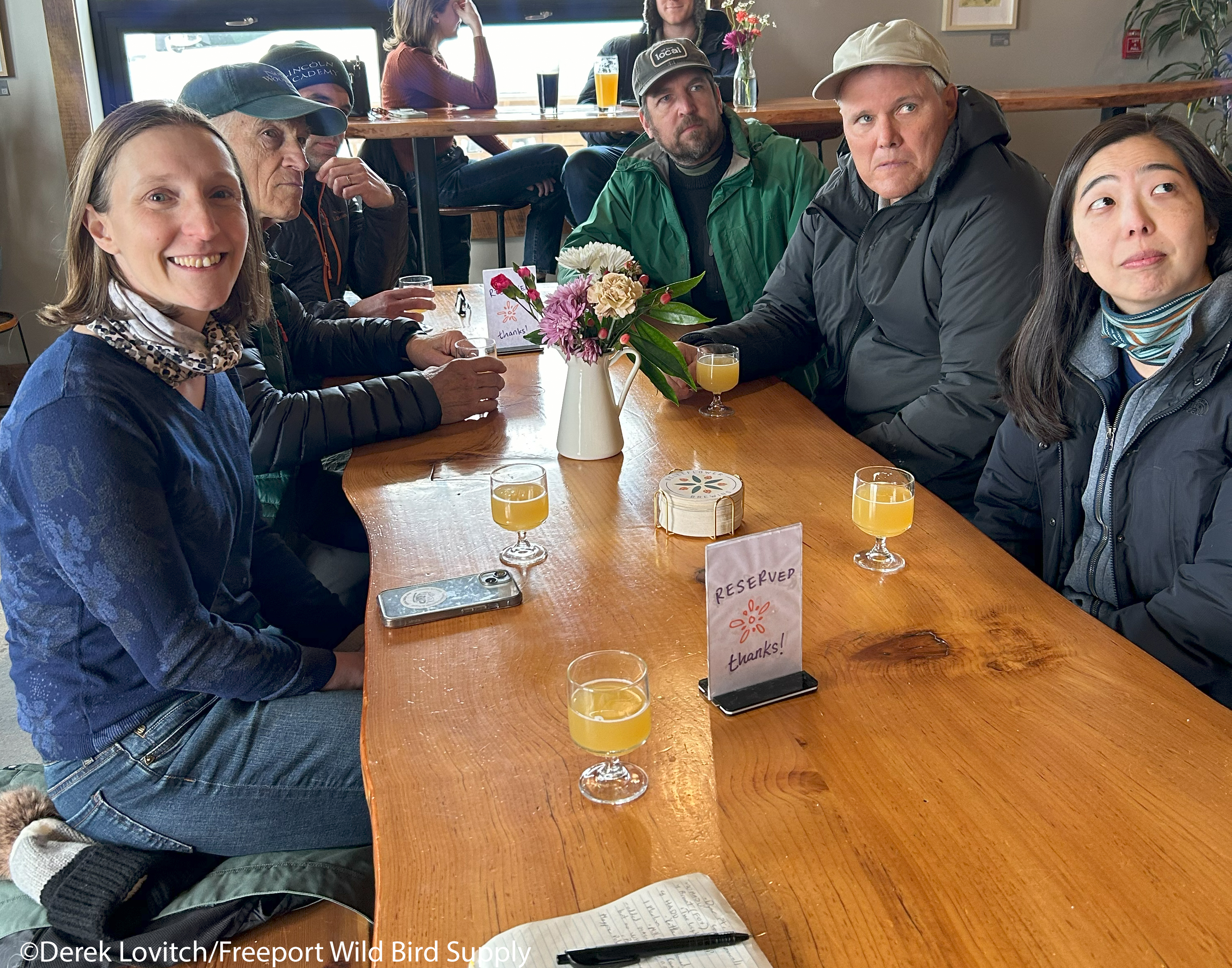 Next up was Definitive Brewing on the other side of town. With so many options, everyone was able to choose their two samples, and there are no shortages of choices here. I went with Robin (because bird names!) their Imperial Pastry Stout and Blueberry Waffles, a pastry sour. I saw lagers, an IPA, and several sours among the group, and this photo captured the rainbow of colors here, with my choices and those of two of the members of the group. Our birding had something for everyone: a rarity for the “life list” and cool behavior from some of our common and beautiful birds as we learned about the mind-blowing feat of migration. And between Belleflower and Definitive, there was most certainly something for every beer drinker!