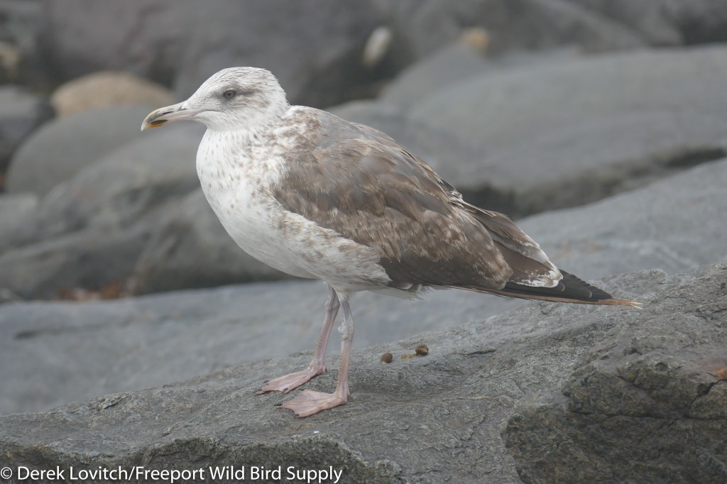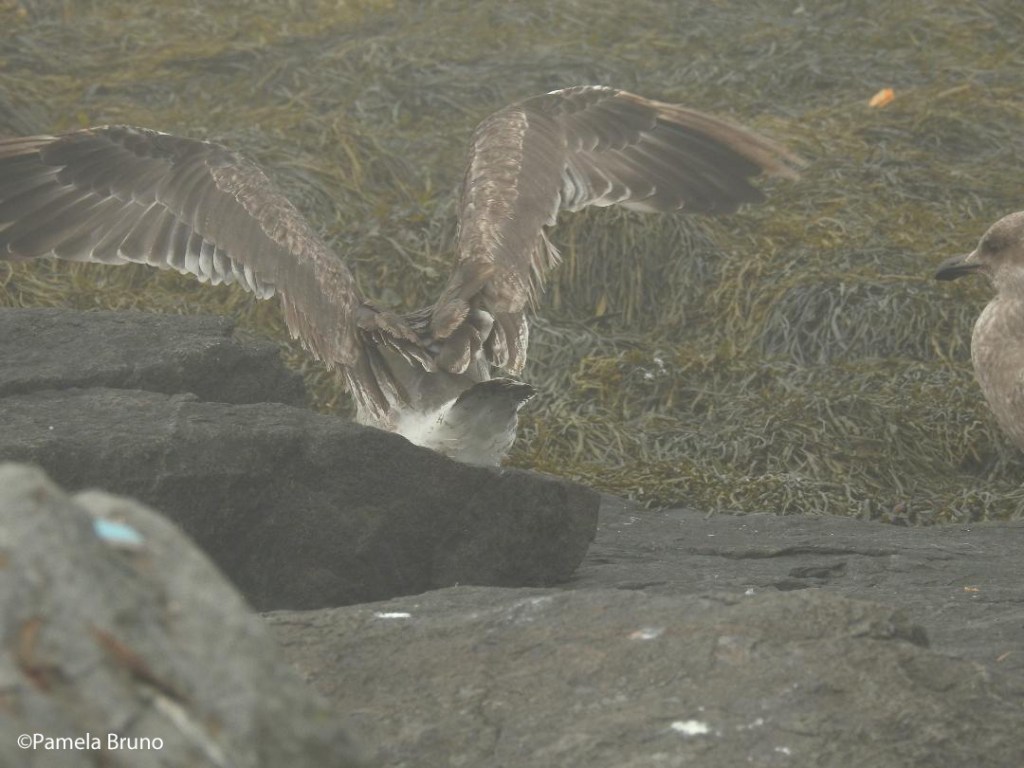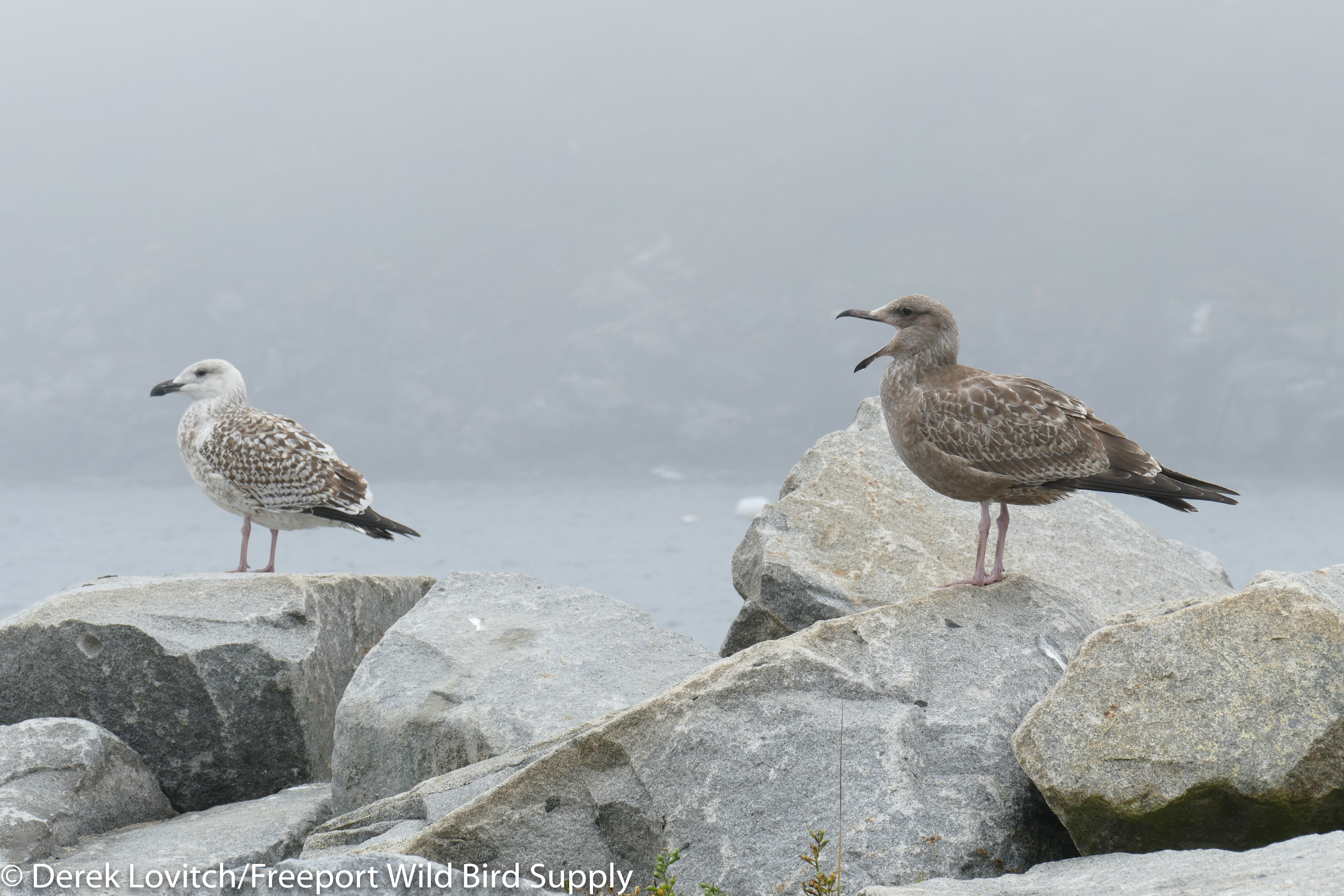We enjoyed ample time to study many common species, such as separating young gulls. Here’s a juvenile Great Black-backed Gull (L) in the background showing its much whiter overall appearance with bold marbling above. Compare that to “the brown one,” the juvenile Herring Gull (R). It wasn’t the only one yawning from another gull lecture!