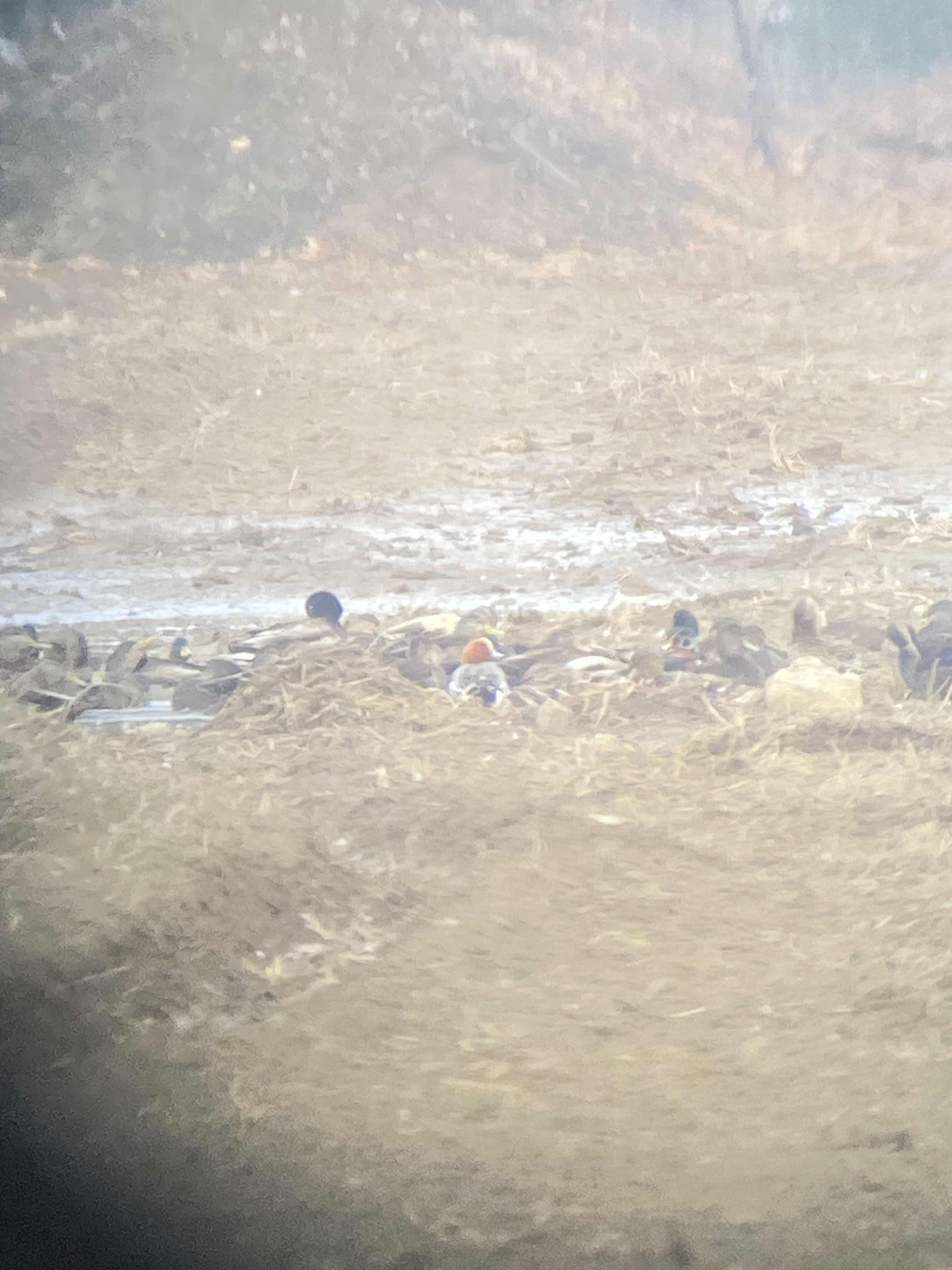 Here’s a poorly phone-scoped image of one of the Common Teal, showing the bold horiztonal white bar across the wing and the lack of a vertical white bar on the side of the chest.