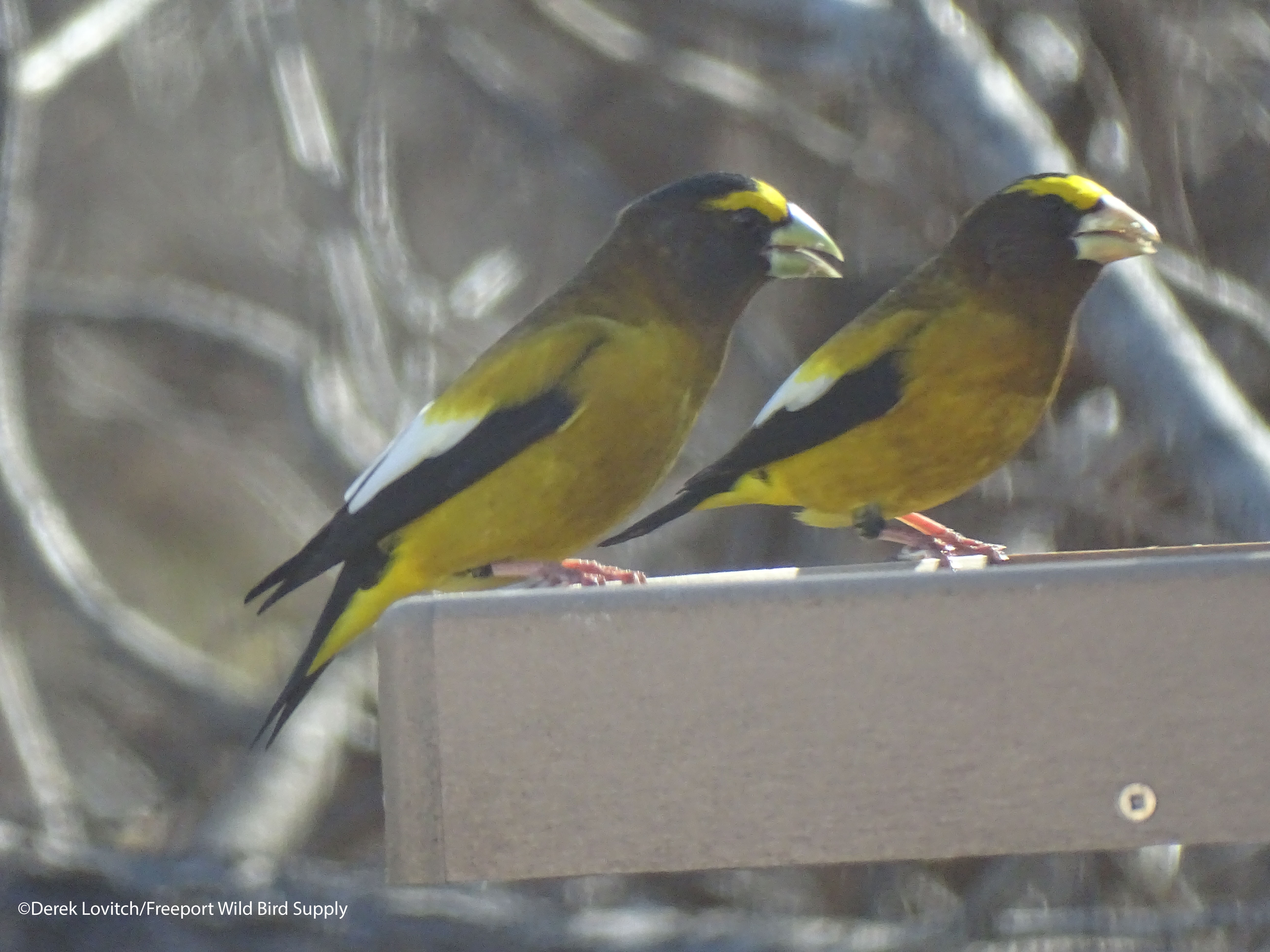2 male Evening Grosbeaks, our feeders in Durham, 4/7.