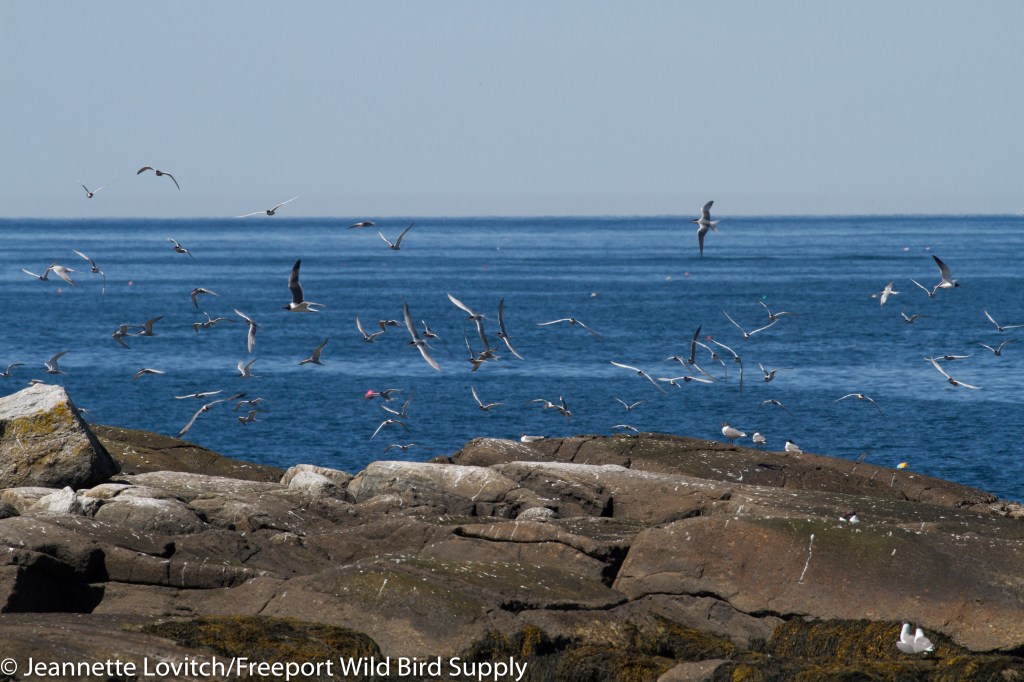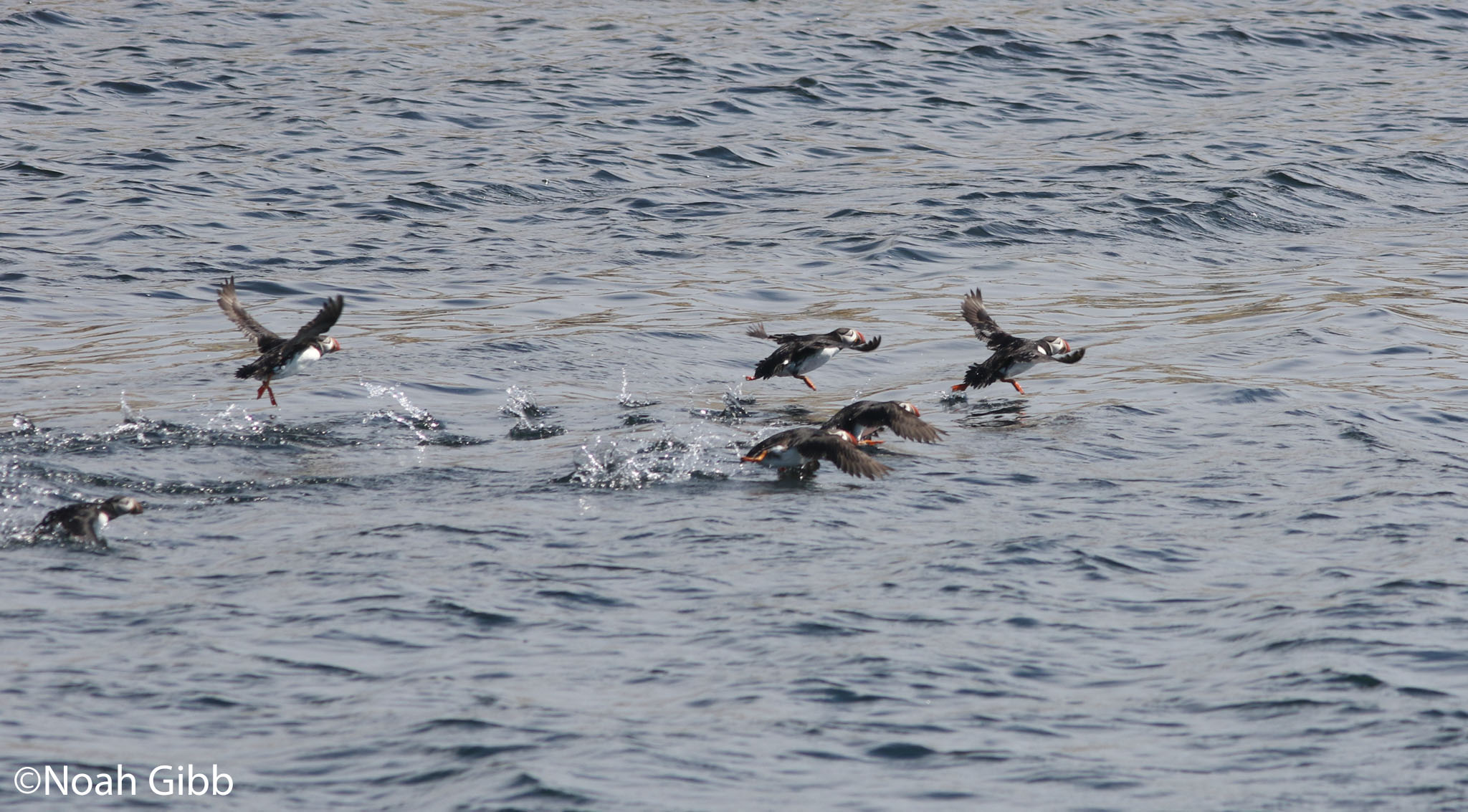 Off the northeast end, we cut the engine and drifted among the alcids.  Off the open waters came a flock of 12 Whimbrel which we heard first before they flew close by. Likely having tanked up on blueberries in a barren Down East or in the Maritimes, they didn’t seem to consider pausing on the island. Later, 8 more flew by even further offshore.