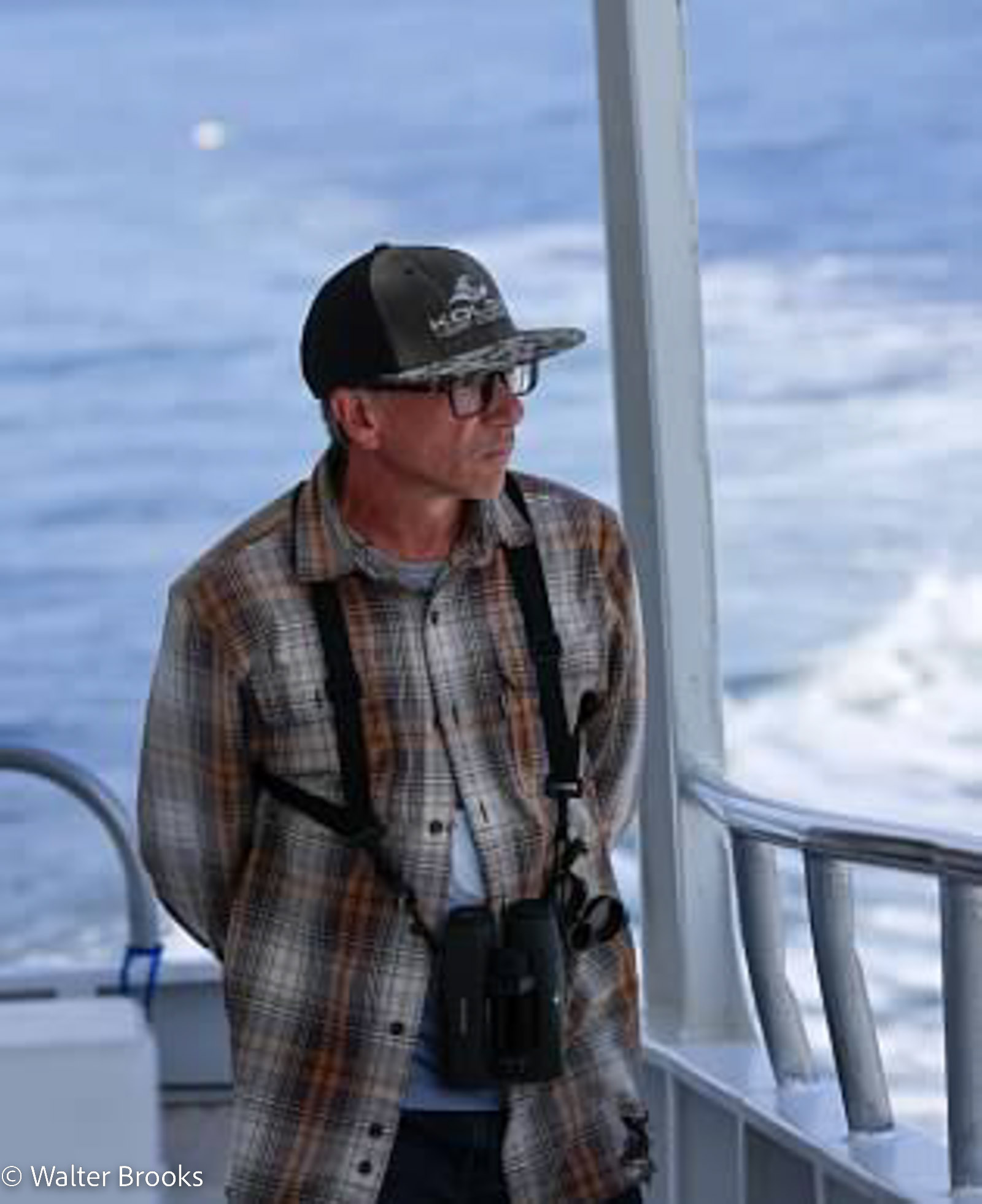 Evan Obercian, Dan Nickerson, and Jeannette helped spot birds, Noah Gibb handled the checklists, and Robby Lambert – chummer emeritus – stood at the ready as the boat’s naturalist, Kelsey, and I scanned from the wheelhouse. Our captain was amazing, and together we laid out a plan for the day. Throughout the day, Rich and Bill from Zeiss handed out binoculars to try and lots of optical questions were answered. It was a great way to test-drive a new pair of excellent binoculars, especially noting how important size and weight is when trying to hold binoculars steady on the open ocean, even without much in the way of waves.