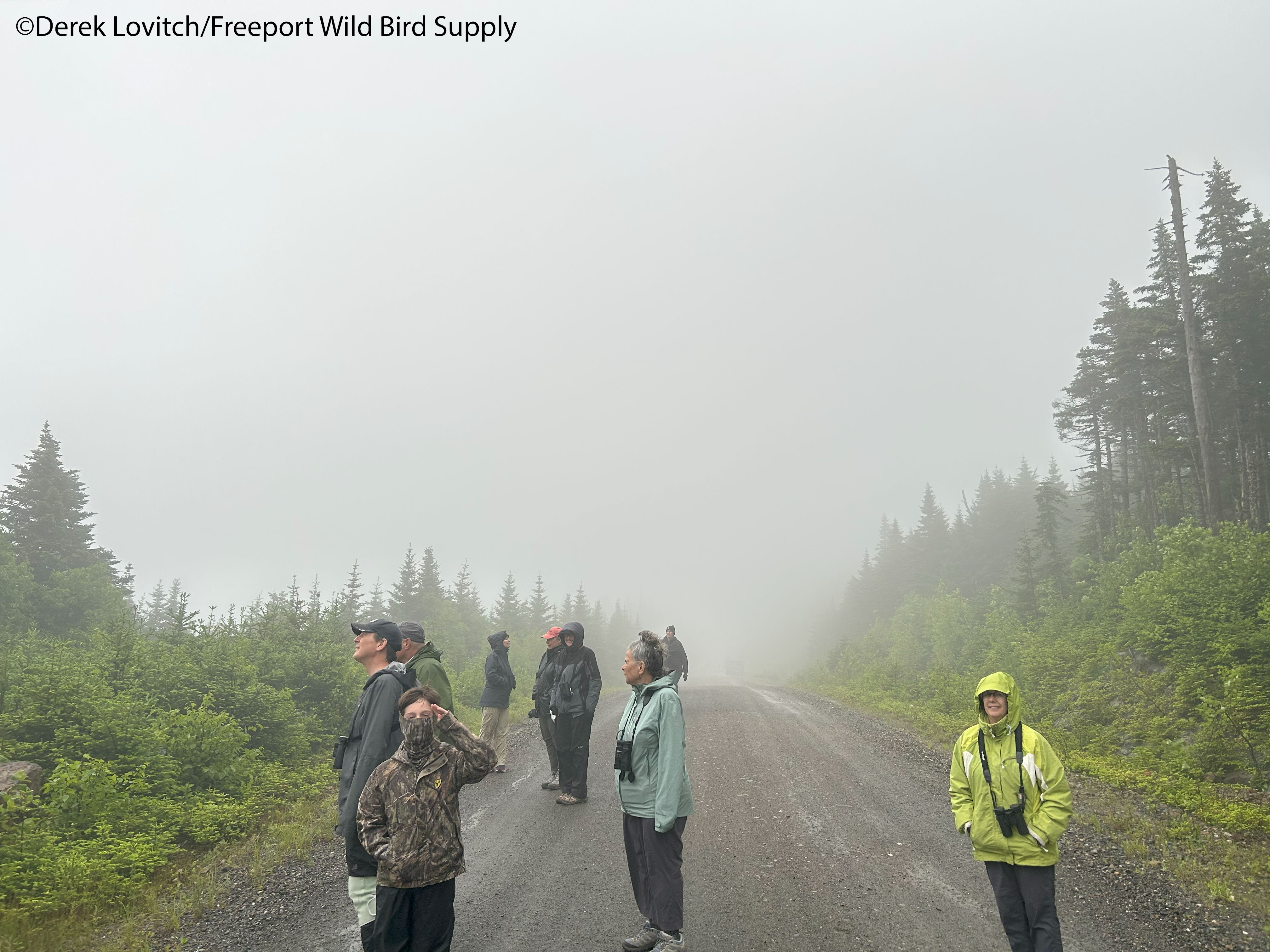 But the morning was by no means the washout we feared, and when the rain stopped, the birding was pretty good. We decided not to bother the Black-backed Woodpeckers (the light was even worse anyway in the fog) given the conditions, but we were happy to hear the begging youngsters from afar. A few Red Crossbills flew over, Blackpoll Warblers were singing, and we heard the mountain’s Fox Sparrow in the distance.