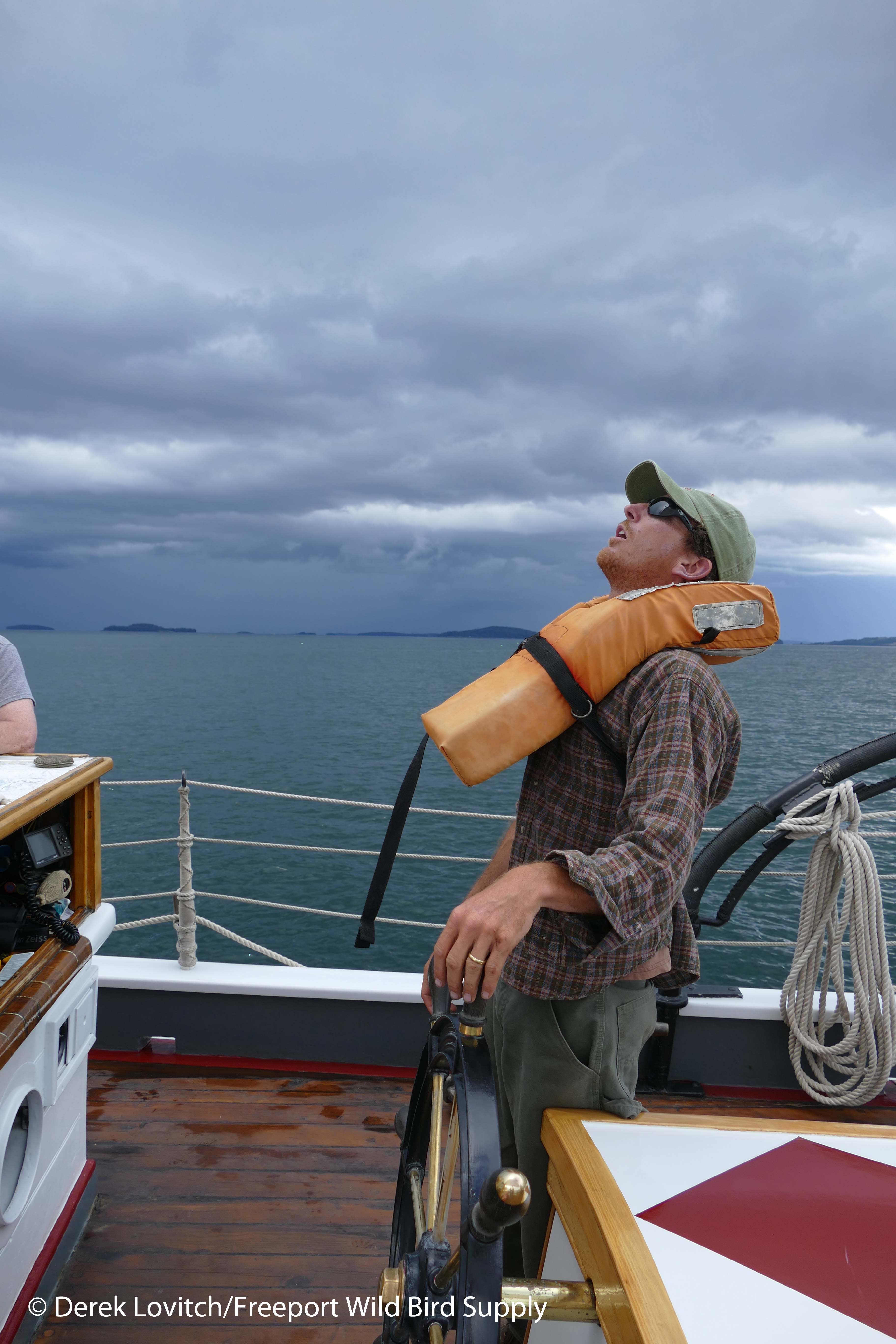 With high hopes, we set off, and pretty soon came across several Wilson’s Storm-Petrels and of course, Black Guillemots. As we cleared the shelter of Isle au Haut, we found more storm-petrels, but we also found leftovers waves from the storm. There were a few pretty big swells remaining, but Captain Tracy handled them with skill and kept us surprisingly comfortable.