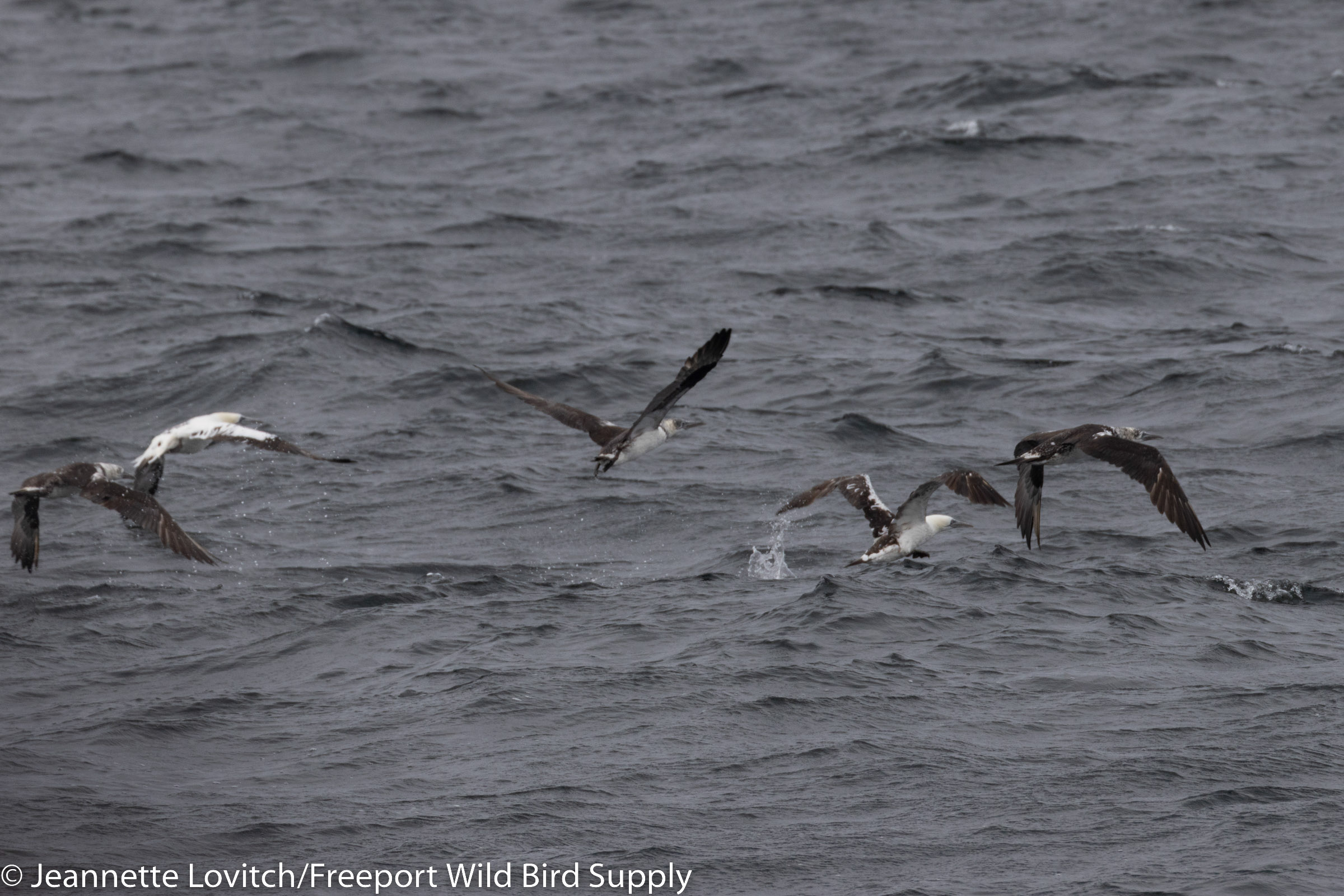 There, in about 500-600 feet of water (but otherwise “in the middle of nowhere”), our chum slick of fish oil and pork fat (generously donated by Durham’s Old Crow Ranch!) worked its magic. Will Broussard, with both the honor and burden of his first time as Chummer, was the hero, bringing Northern Fulmars and Great Shearwaters in for close looks.]