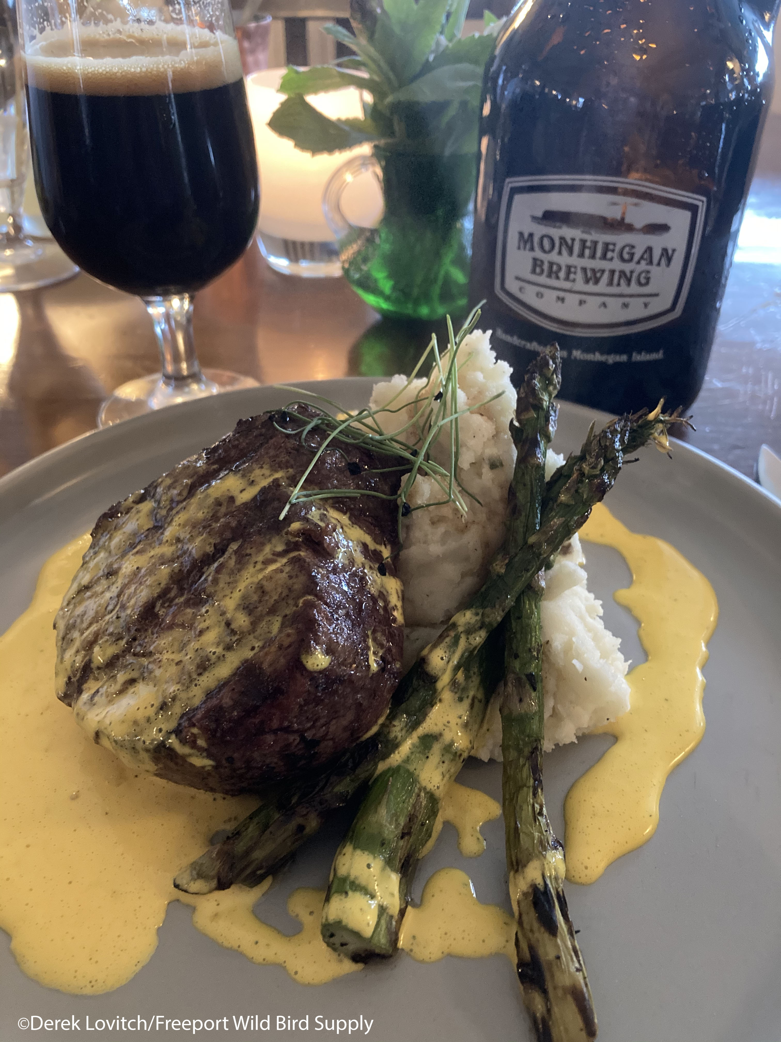 Not only had they opened just for us, they fired up the woodstove, and we rapidly dried out the remnants of that rain in Waterboro. Concentrating on classic German styles, we learned about Gneiss’s brewing philosophy and operation. Having produced 400 barrels last year, plans are in the works for future expansion and canning. We glimpsed a Wild Turkey strutting through the backyard as we toured the facility and sampled four of their beers.