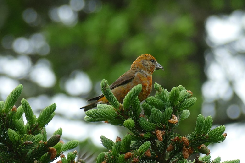 2 Red Crossbills, feeding on Scots Pine here at the store, 5/1.