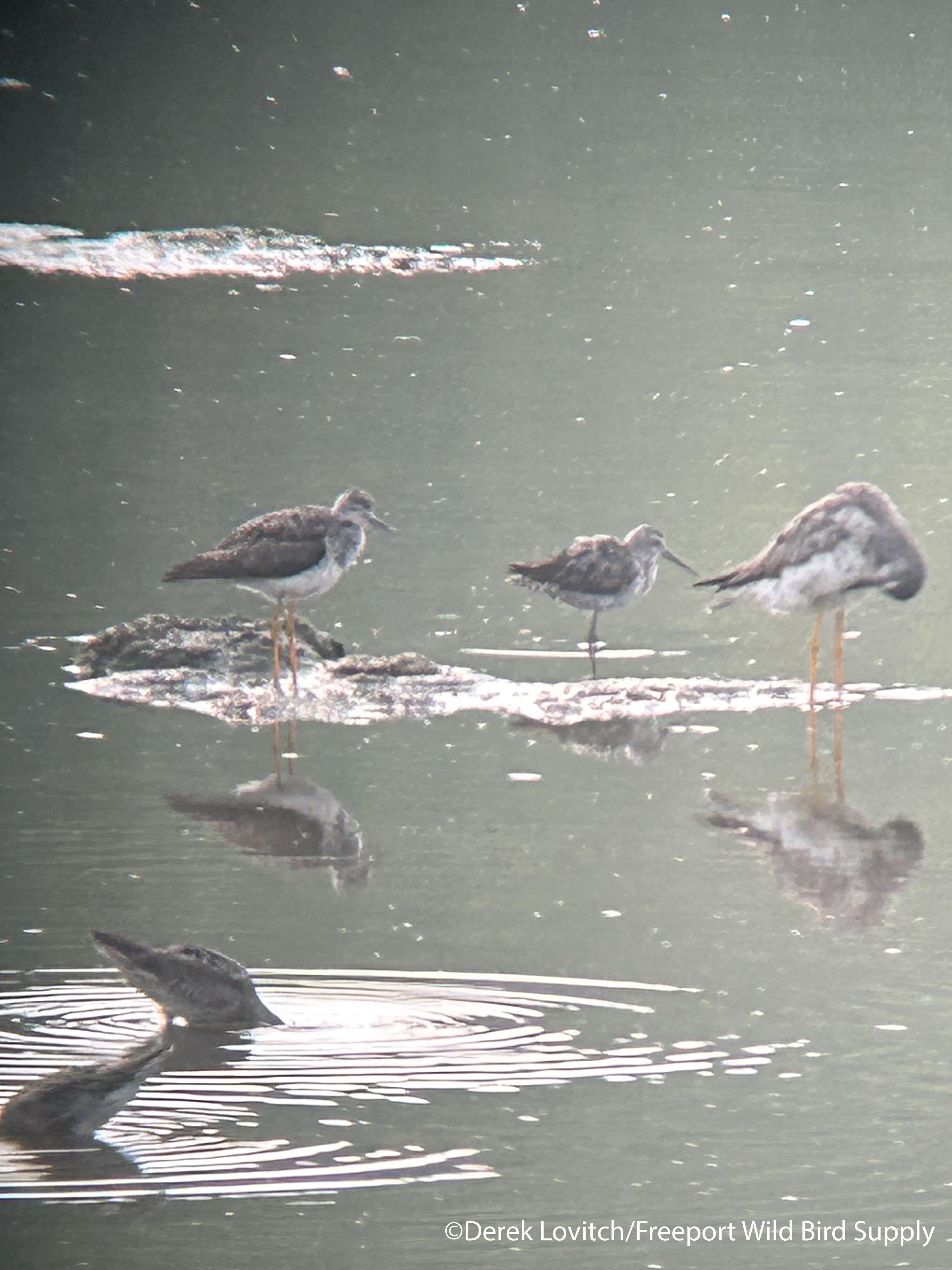 Far from being my best shot of the week, our Saturday Morning Birdwalk group enjoyed 2 Stilt Sandpipers at Freeport’s Walsh Preserve. Here’s one of them (pardon the lousy hand-held phone-scoped photo) flanked by Lesser and Greater Yellowlegs for a perfect comparison. Instructional shorebird identification was the name of the game for my tours this week!