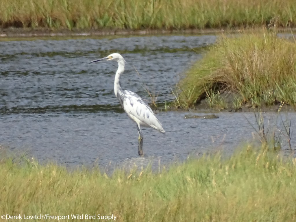 1 continuing postulated TRICOLORED HERON X SMALL WHITE EGRETTA SPP, aka “Patches,” Eastern Road Trail, Scarborough Marsh, 8/26. Photo and notes above.