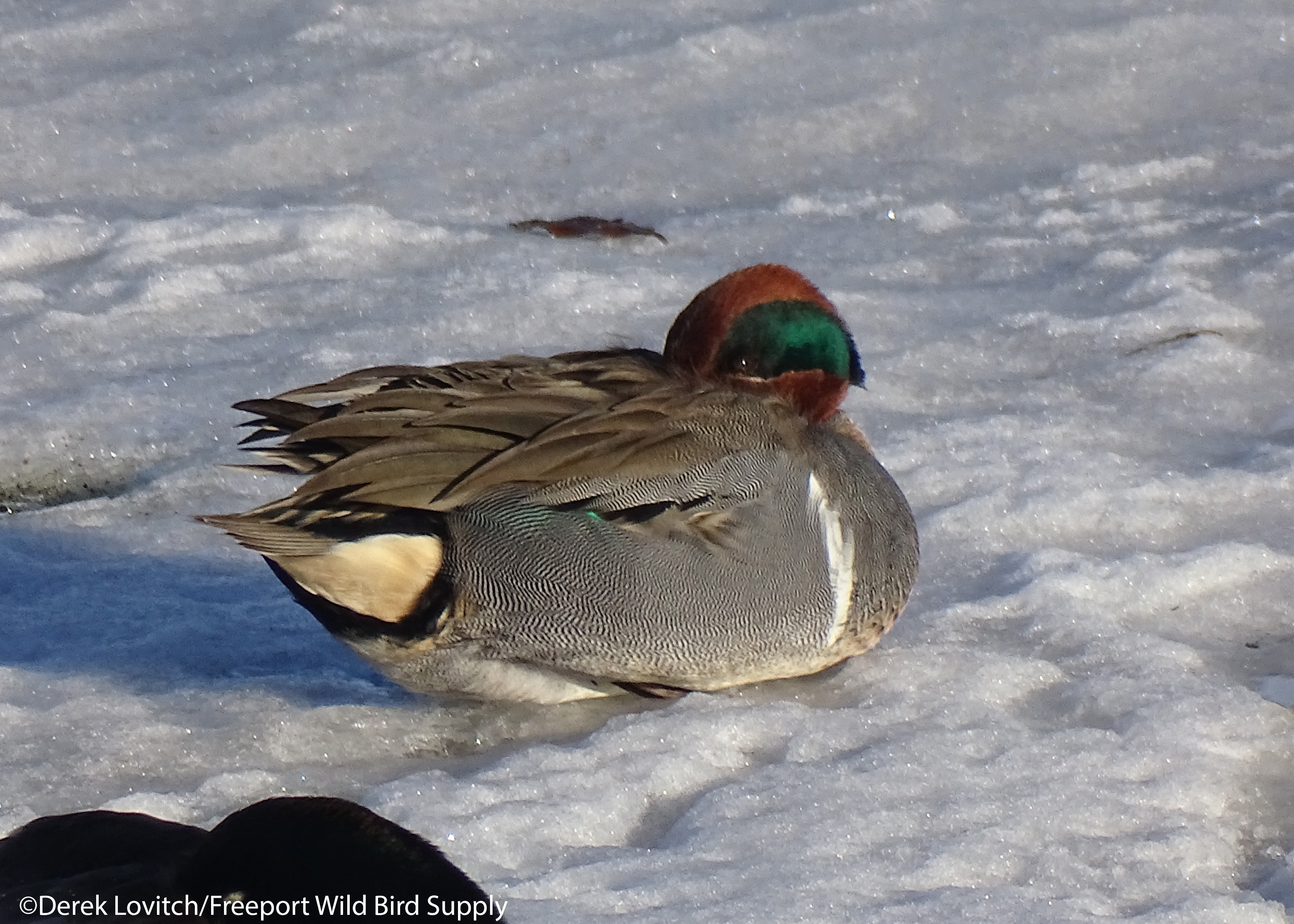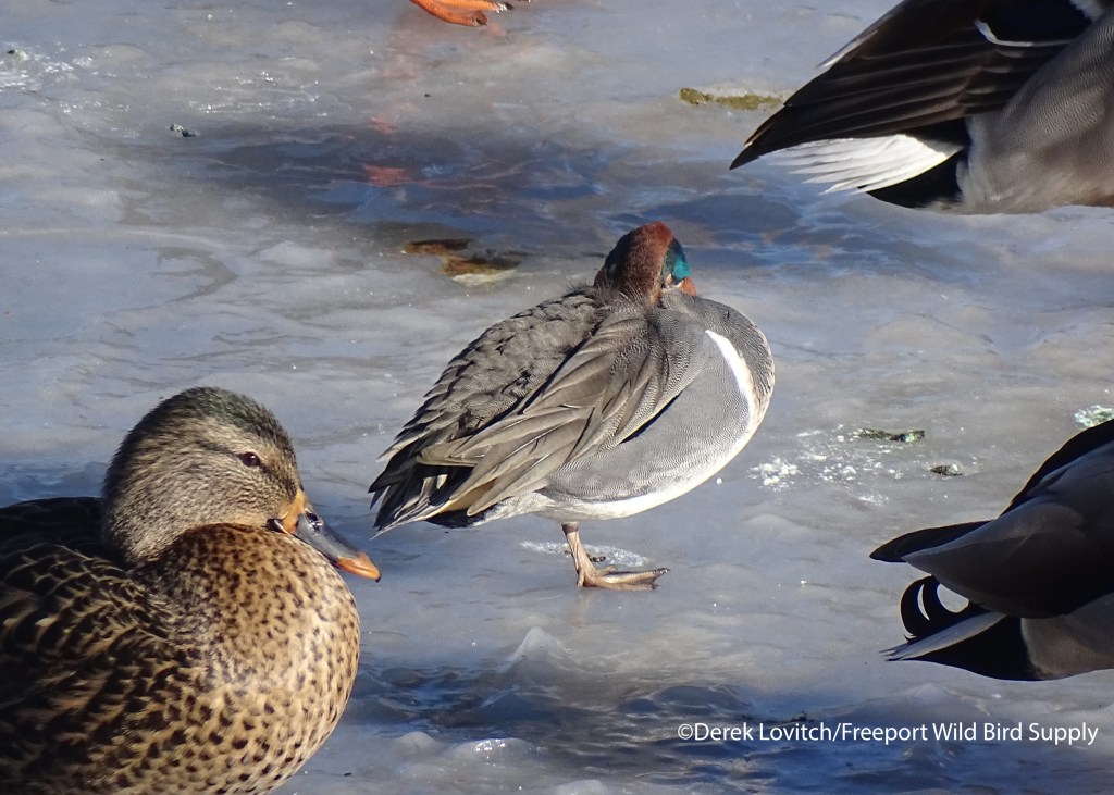 These tarrying drake Green-winged Teal were snoozing in the Mallard flock along the Auburn Riverwalk on the 16th (above) and at Mill Creek Cove in South Portland on the 18th (below). I don’t like to disturb birds, so I have lots of sleeping duck photos! I enjoy the calmness of it, and one can really take in the intricacies of the rest of the plumage that way.