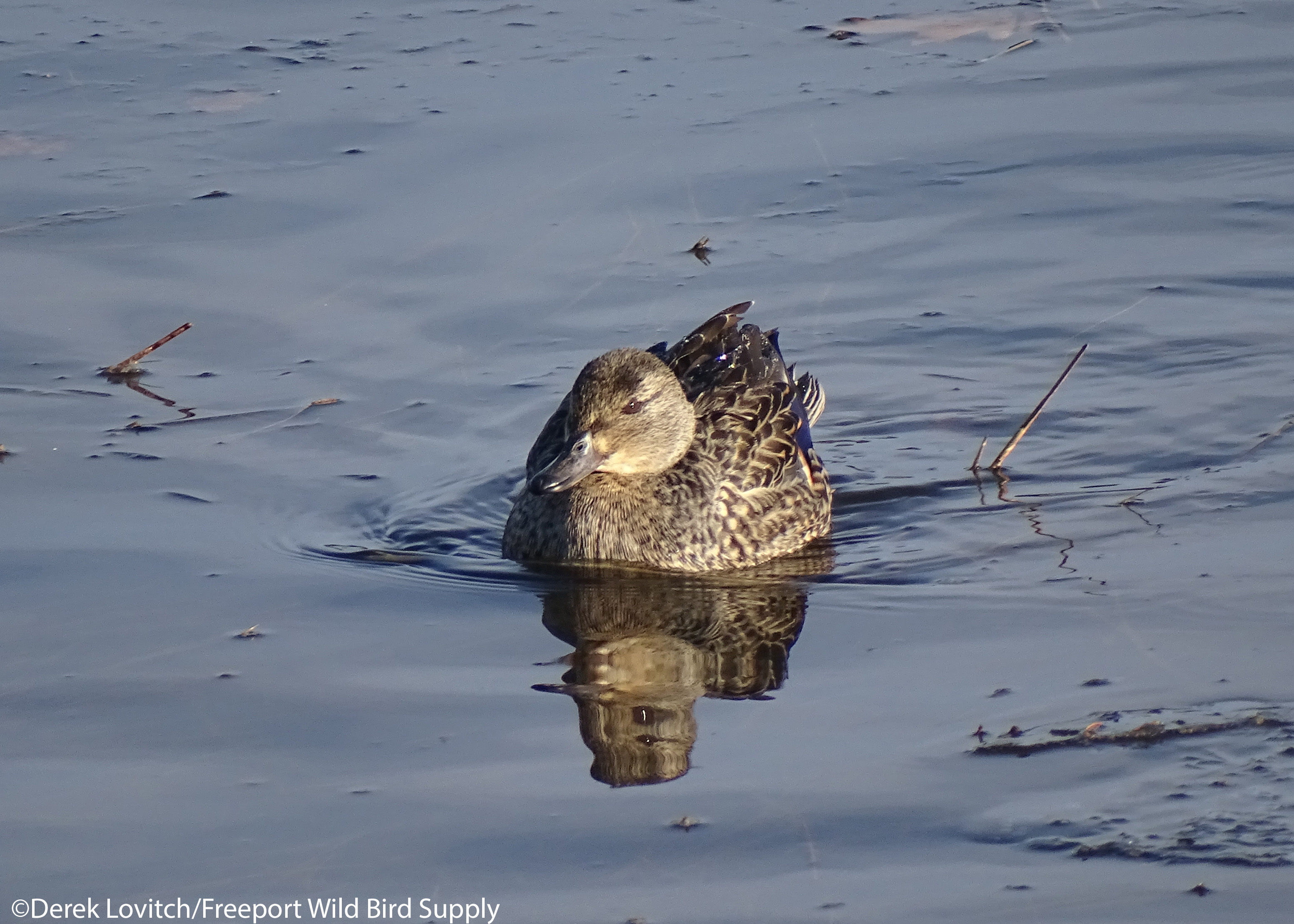 This hen Green-winged Teal, her plumage no less detailed and intricate than the male’s, was also dozing at Mill Creek Cove on the 18th. She woke up and took a swim though!