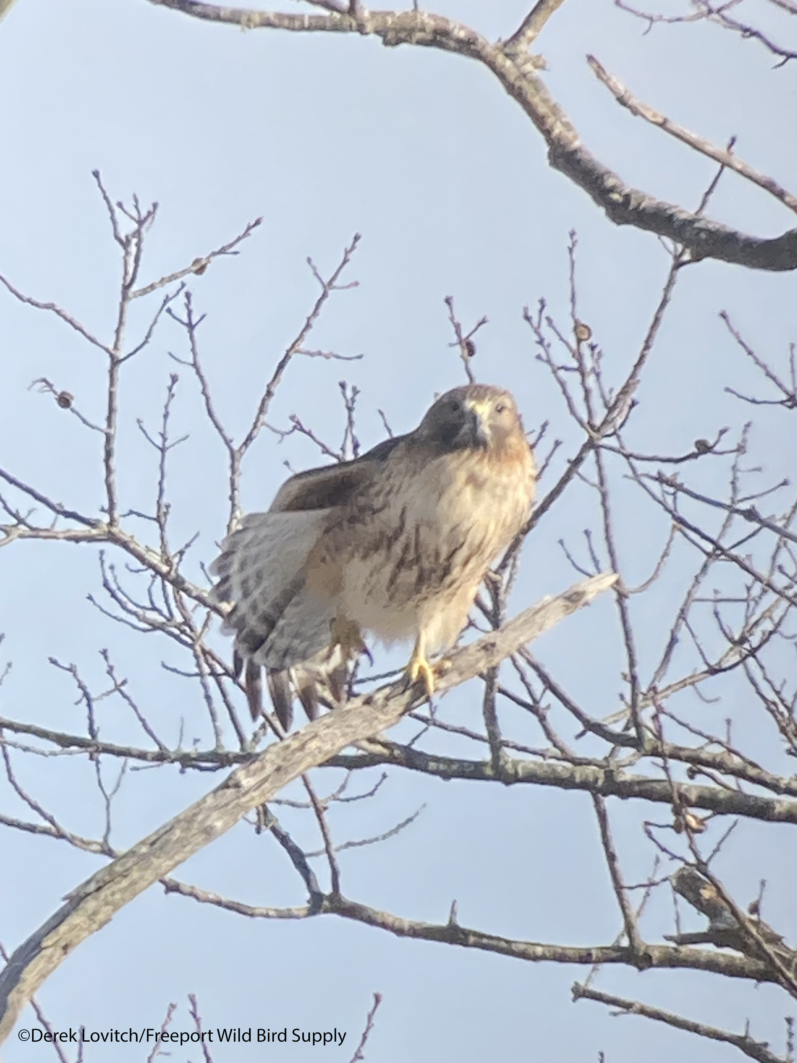 • 1 continuing (for several years) RED-SHOULDERED X RED-TAILED HAWK HYBRID, Timber Point, Biddeford, 2/11 (with Bill Thompson). Photos above. This was my best photo session and quality time with the bird over the years, allowing for detailed study and extensive photographs, especially by Bill. See phone-scoped photos above. This really rare bird is quite gorgeous. The RSHA-like banded tail has an orange-red wash in the white stripes on the uppersides while the underside has as diffuse, partial RSHA pattern. The underparts have a dull orange blush and/or fine barring (strongest on the underwing) like RSHA, with a diffuse RTHA’s belly band. The head and bill size and shape seemed more RSHA-like, and the powered flight was very much like a RSHA. Such a cool bird!